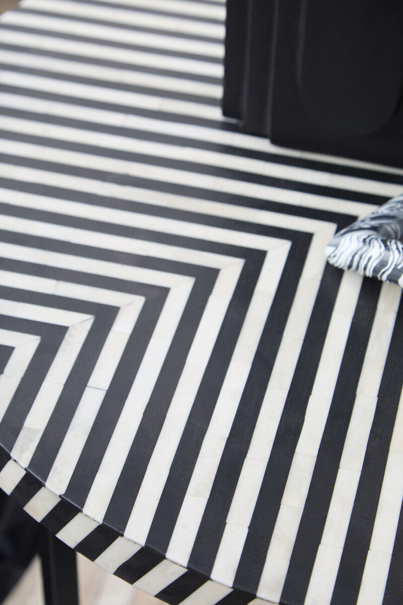 The table fits beautifully in compact lounges and pairs easily with modular seating. The monochrome pattern of the inlay adds depth and rhythm, creating a striking backdrop for a tray, a vase of greenery, or stacked books.