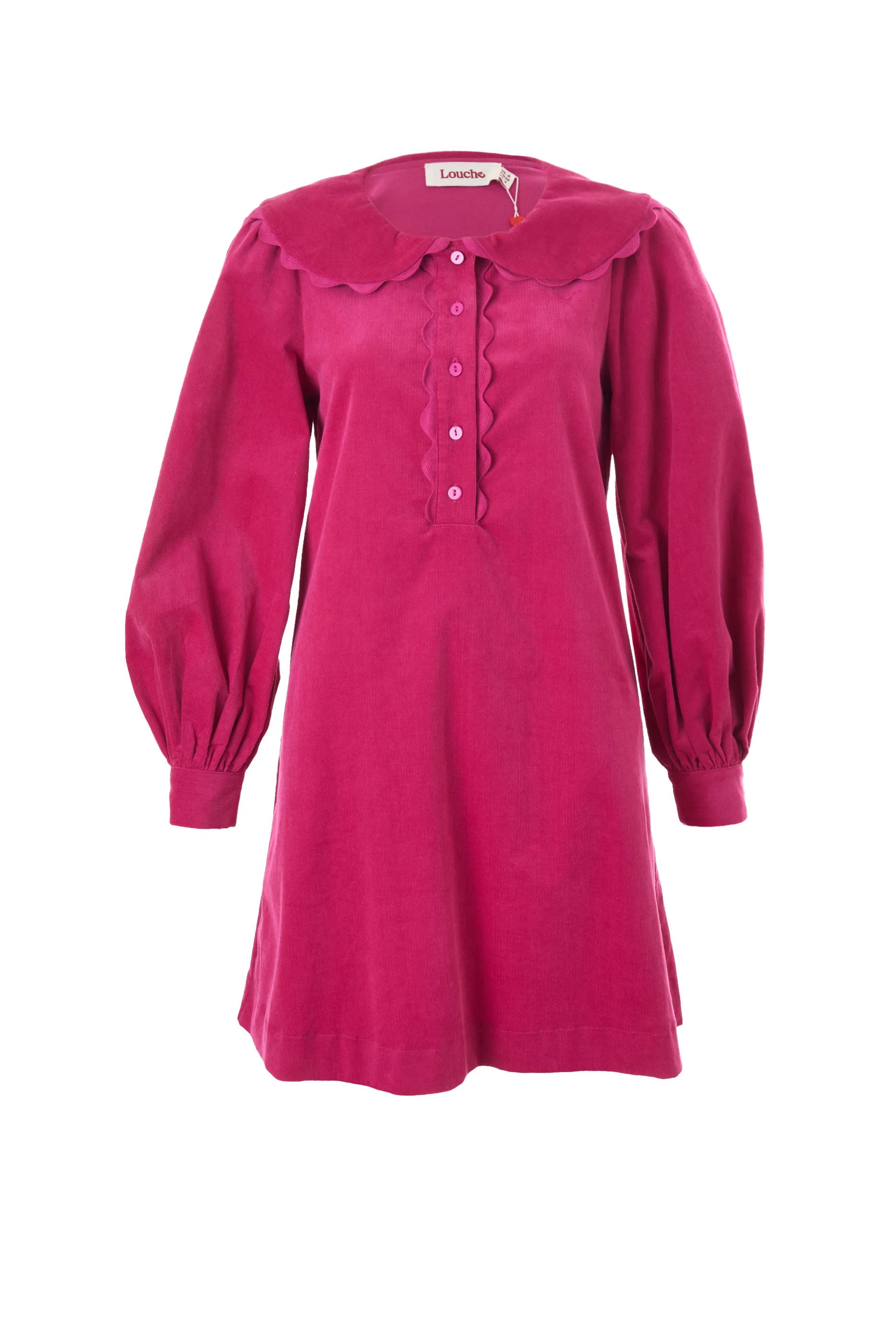 This transitional dopamine pink baby cord mini dress will take you through the winter festivities and beyond. Bonny an easy-to-wear A-line baby cord dress features a statement collar trimmed with giant ricrac and those essential side seam pockets.