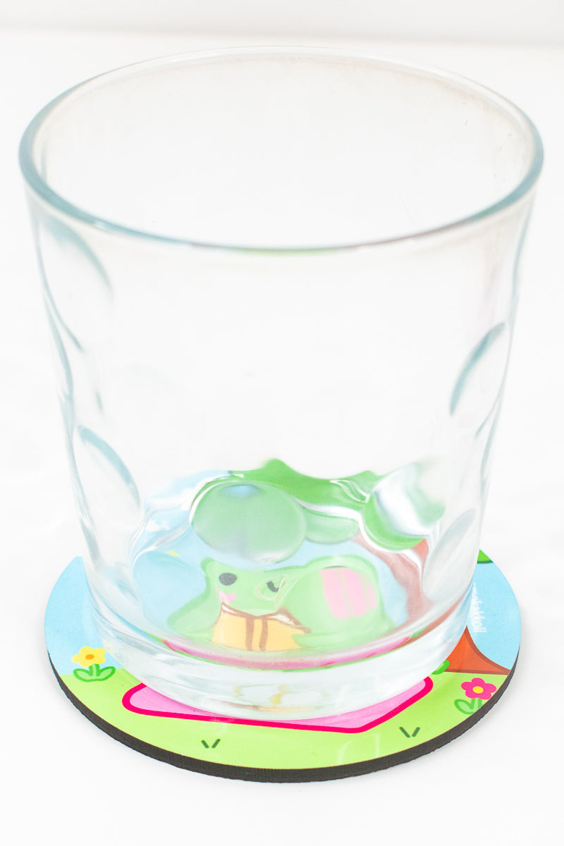 This round 10cm cutie features our blushing froggy bestie sitting on a picnic blanket with a book, ready to protect your desk, nightstand, or altar from evil water rings. The non-slip cork base keeps everything in place, even during the most chaotic sipping sessions.
