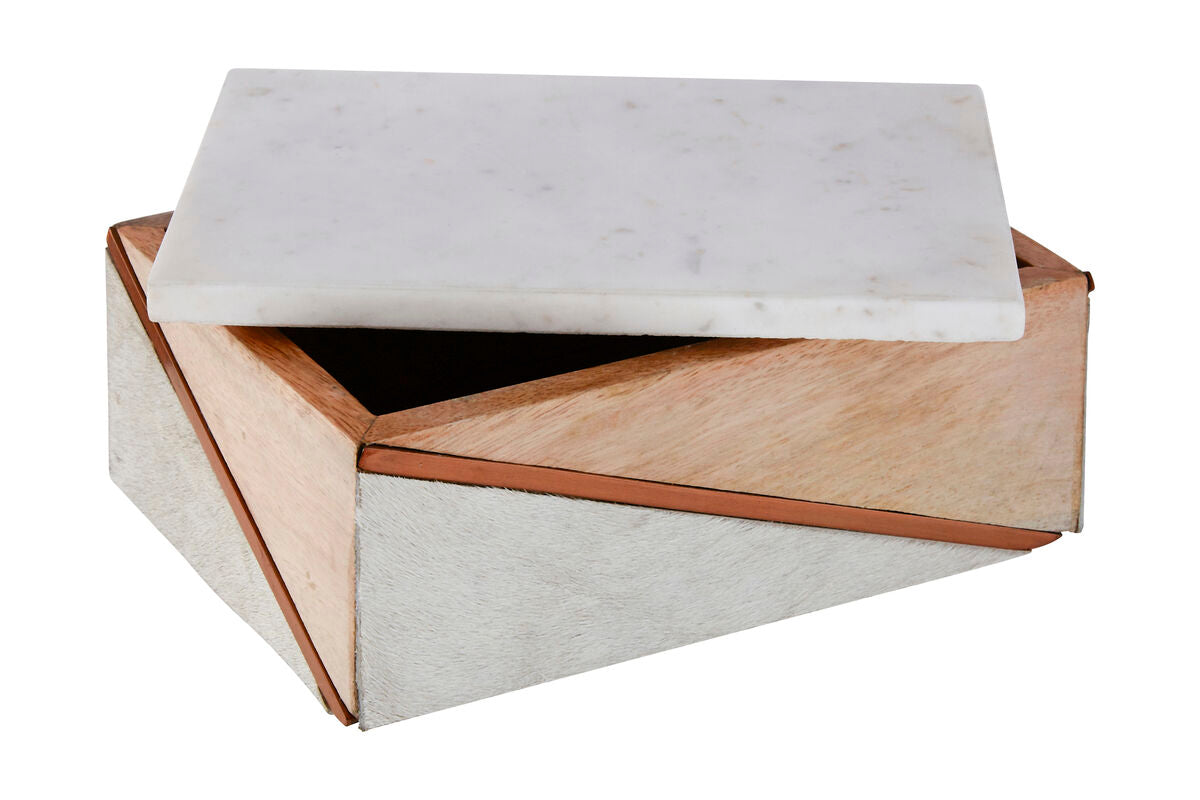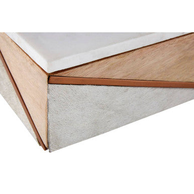 Each face features a diagonal strip of copper finished iron dividing two triangular sections. The top section is exposed mango wood, with prominent graining, while the bottom section is finished with genuine white cowhide. Its rectangle shaped white marble top features subtle grey veining characteristic of the luxurious material.