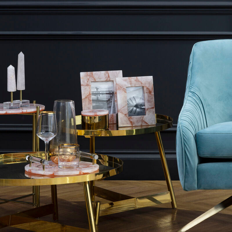 At Orsina, the Bowerbird Pink Quartz Tray transforms serving and styling into a luminous ritual. This pink quartz tray is carved from solid stone with natural veining and fitted with clear acrylic handles set over warm metallic mounts, creating an elevated platform for drinks, candles, and perfume bottles.