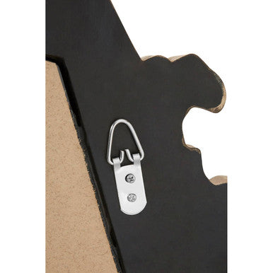 The frame follows a traditional cartouche shape with undulating lines and a tapering lower section. A large clamshell motif is situated at the base, with a fleur-de-lis positioned at the top that adds to its decorative character. It has an antique gold colour with a weathered finish that gives it a rustic look.