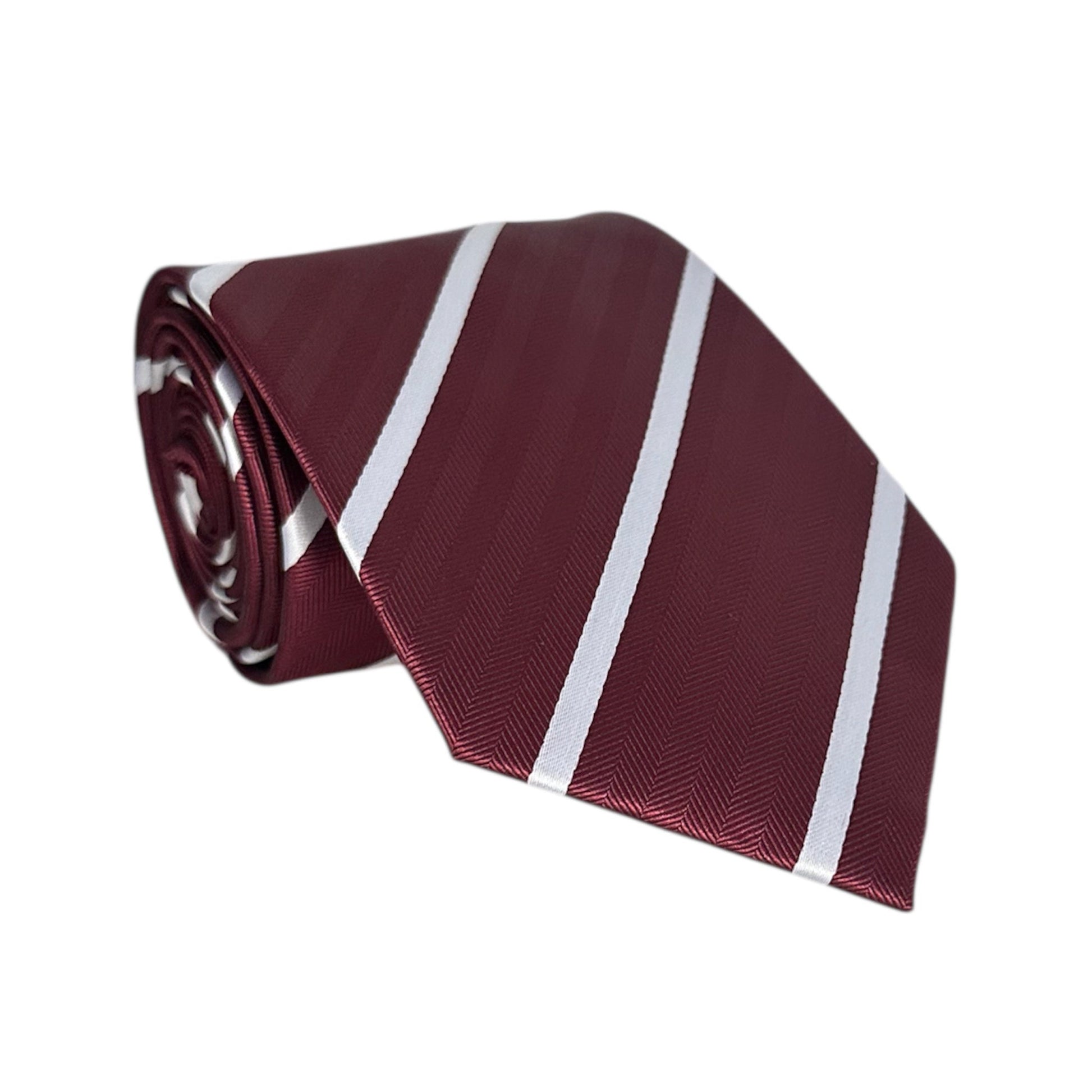 Elegant and refined, this burgundy herringbone tie features a crisp white single stripe for a sleek, timeless look.