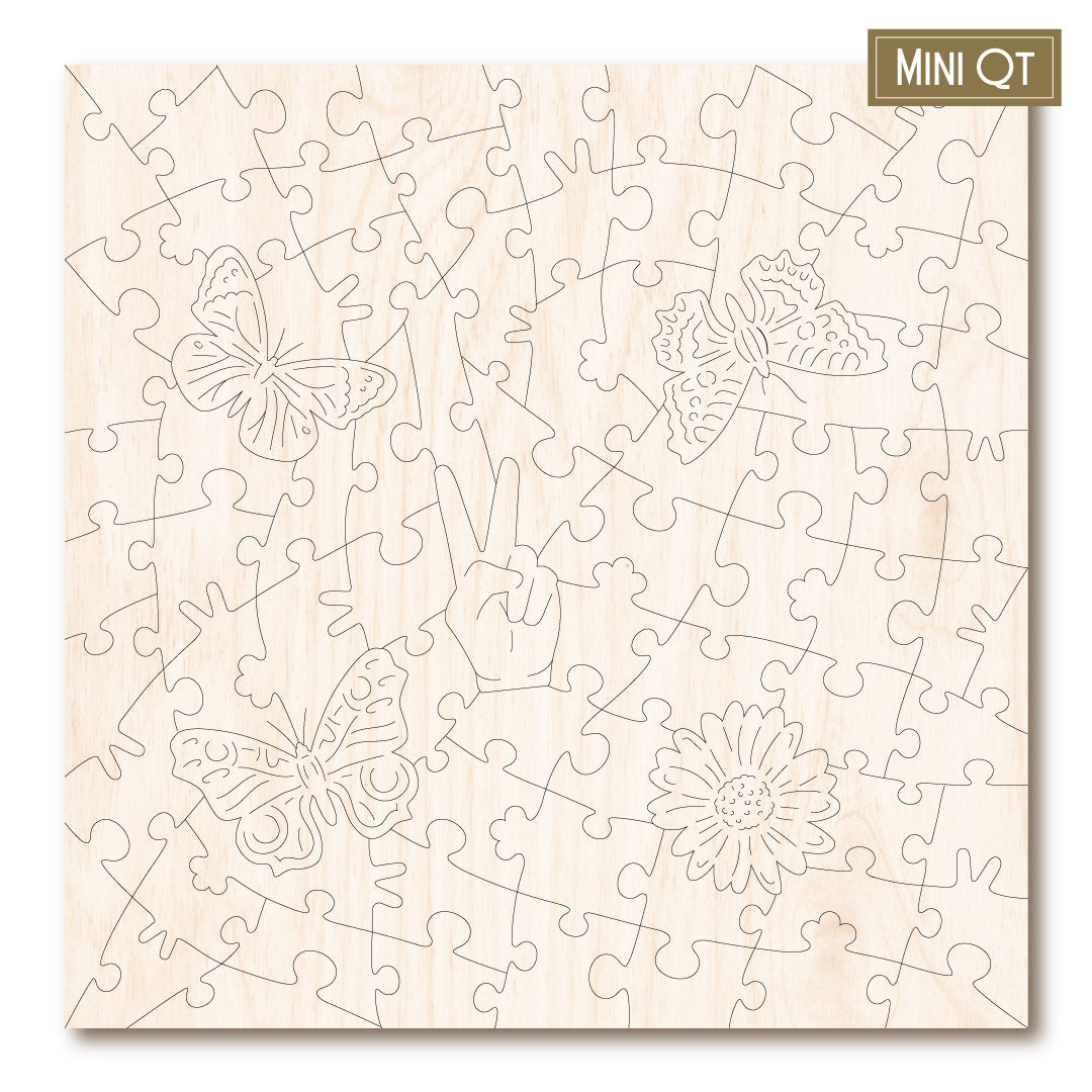 Our MINI QT puzzles are laser cut from thick, 4mm plywood and include 5 whimsies - they make a great puzzle snack!
