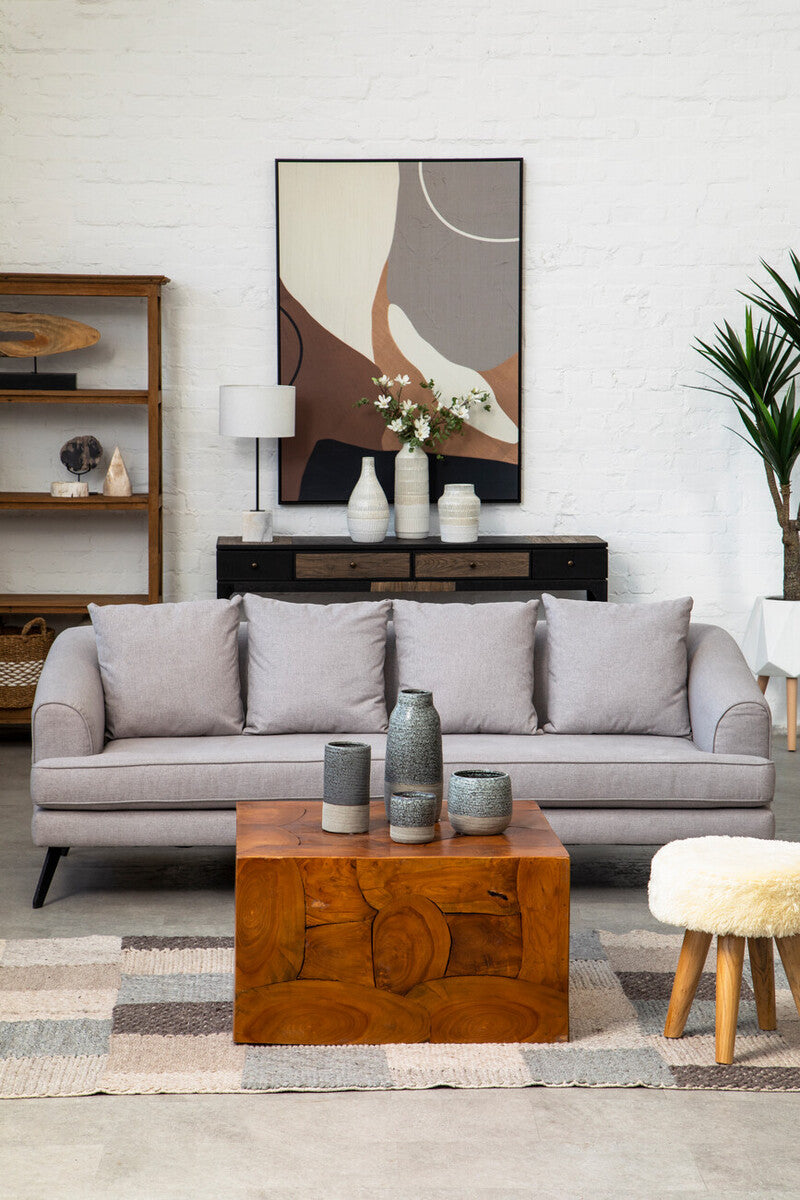 This bottled vase boasts an understated elegance with its two tonal contrast of light and dark grey hues. The larger part of the stoneware vase features a speckled effect detail with a touch of tactility at the bottom. The minimal silhouette of this modern vase makes it ideal to display a verdant plant or a vibrant arrangement of flowers, offering contemporary sophistication to your space.