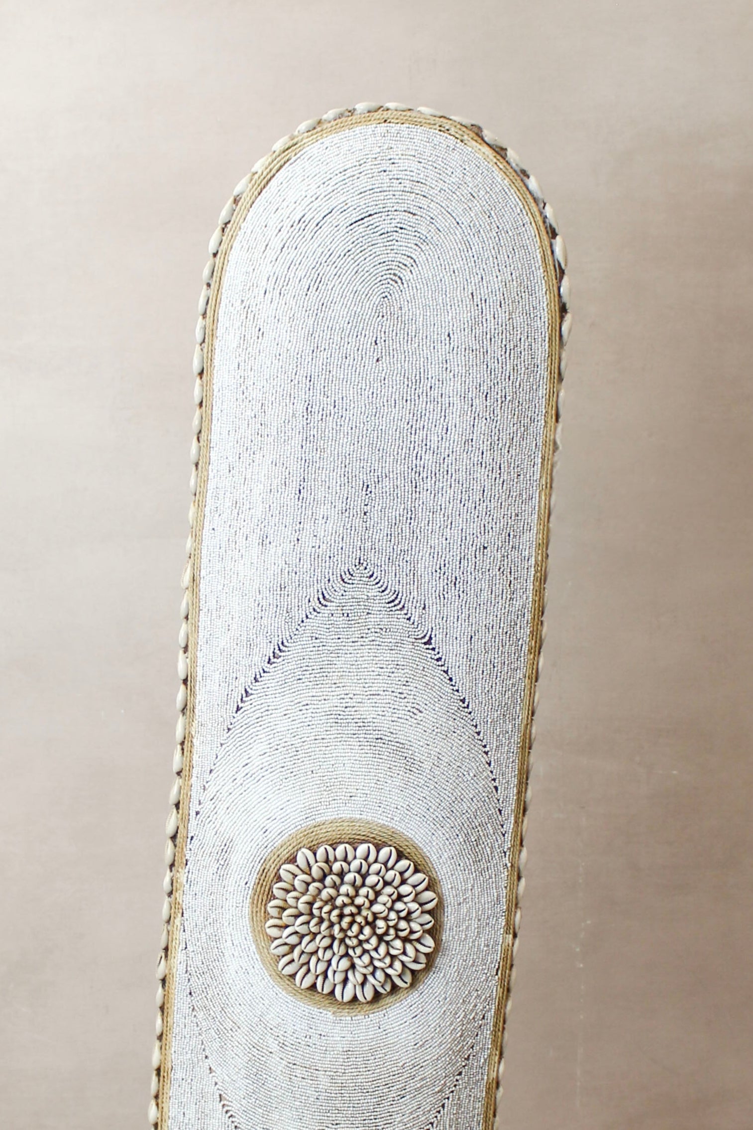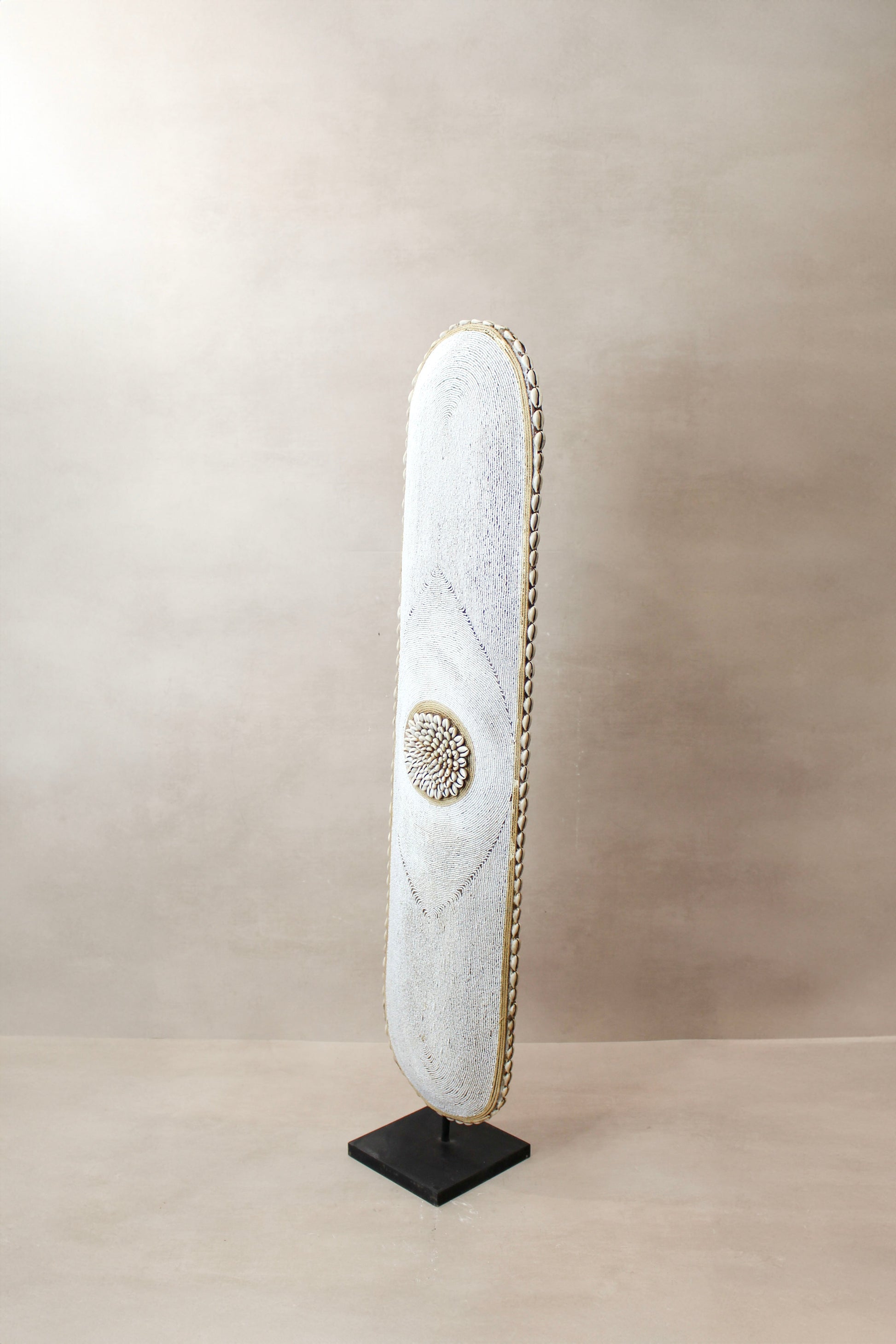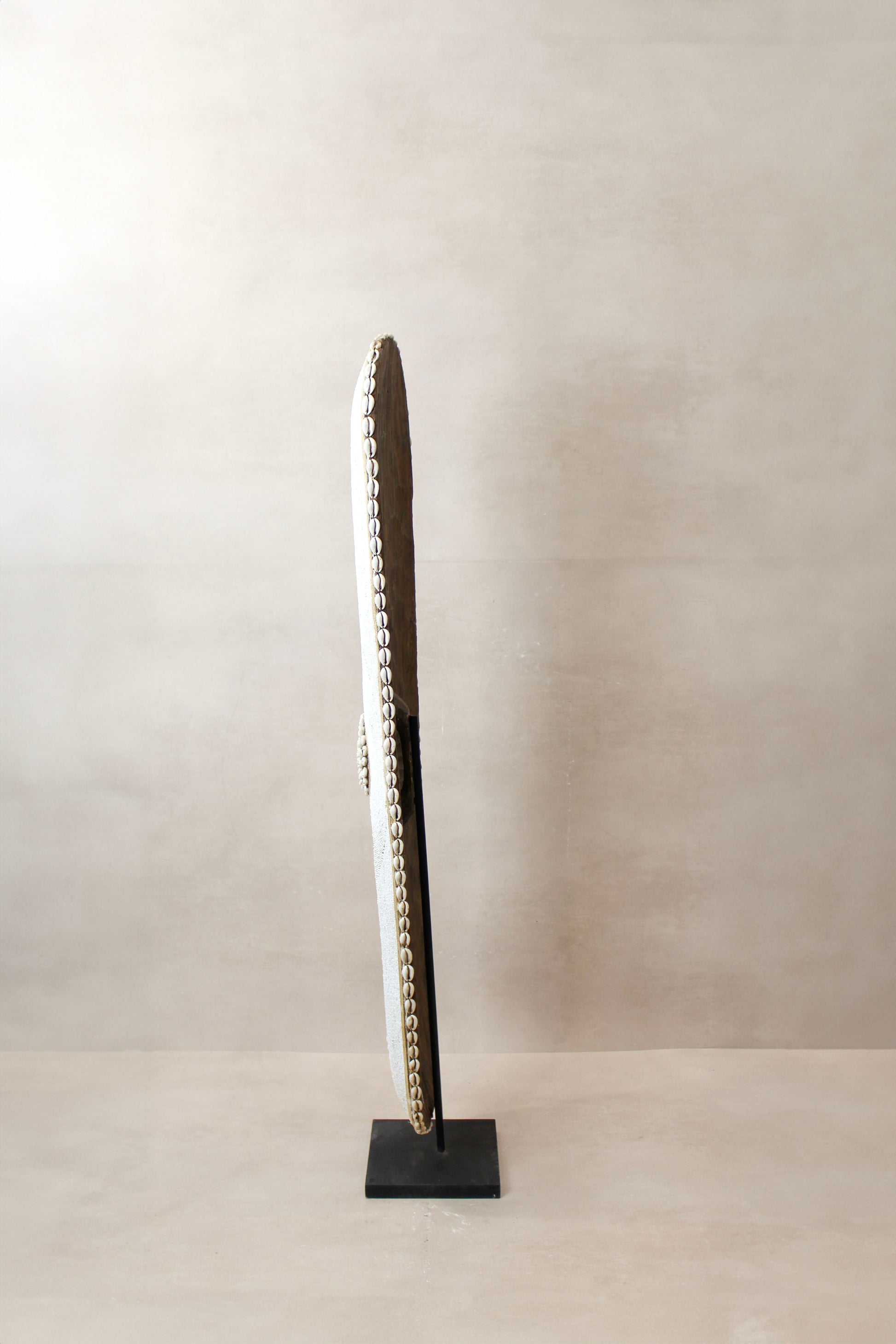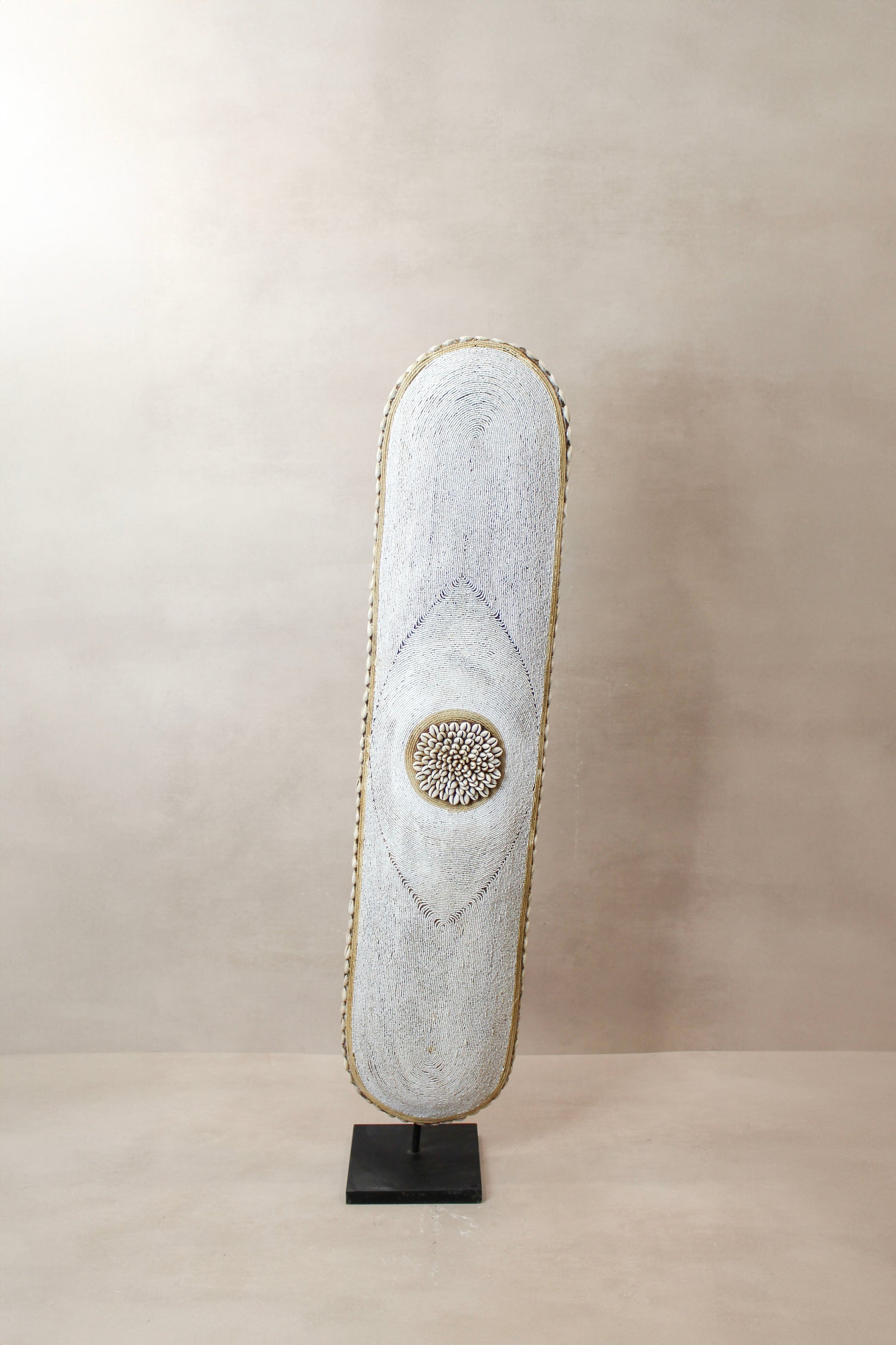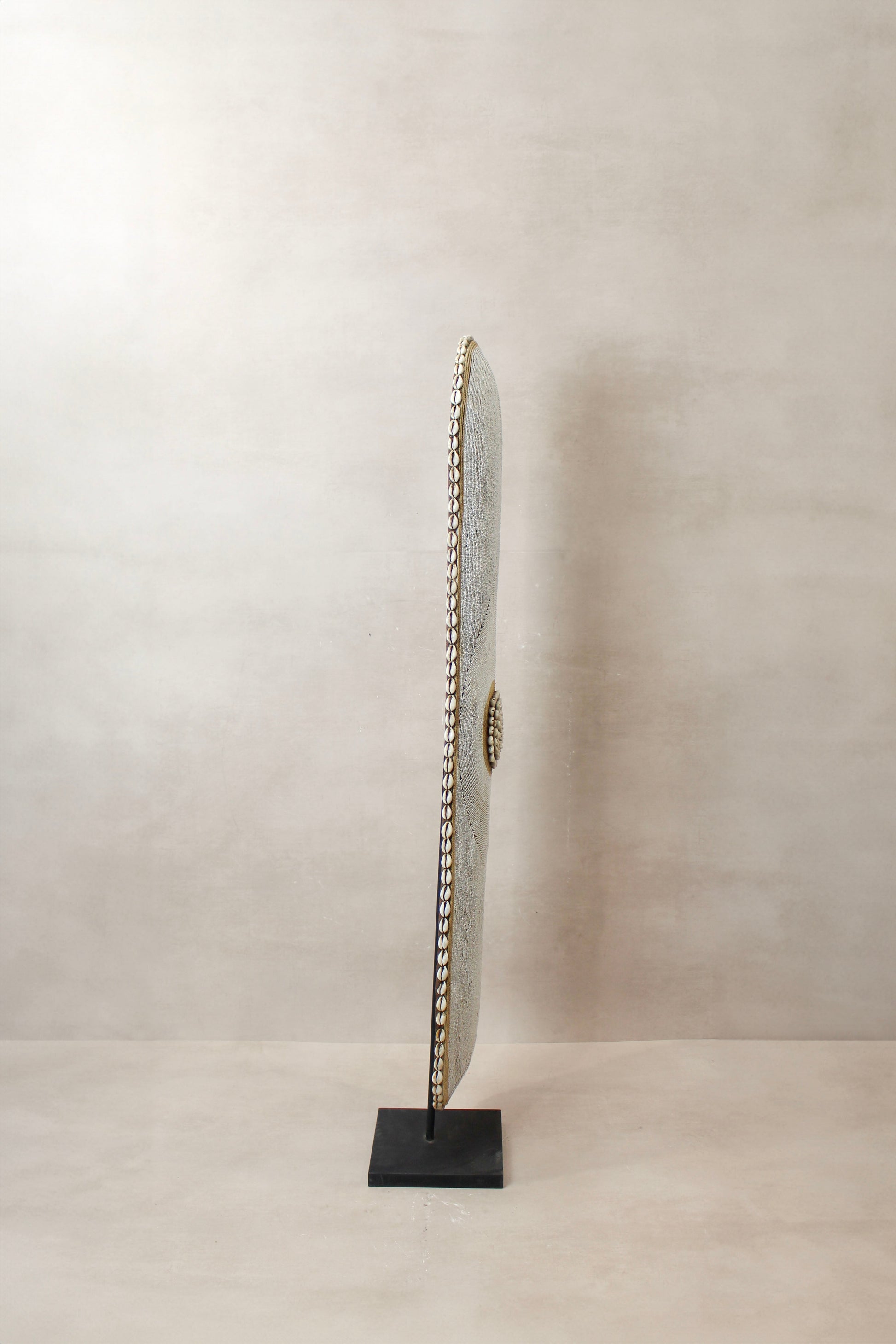 Historically used as a defensive weapon in wartime and displayed as a decorative symbol of status and wealth by the Tikar people in Cameroon. Meticulously crafted, carved from one solid piece of Baobab wood, a sacred wood used for medicinal and ritual purposes for centuries, this large shield boasts hundreds of hand-placed beads on manila string in a circular pattern around a dimensional cluster of natural cowrie shells in the centre. These decorative shields are one-of-a-kind, collaboratively crafted by a large group of people to make each piece unique.