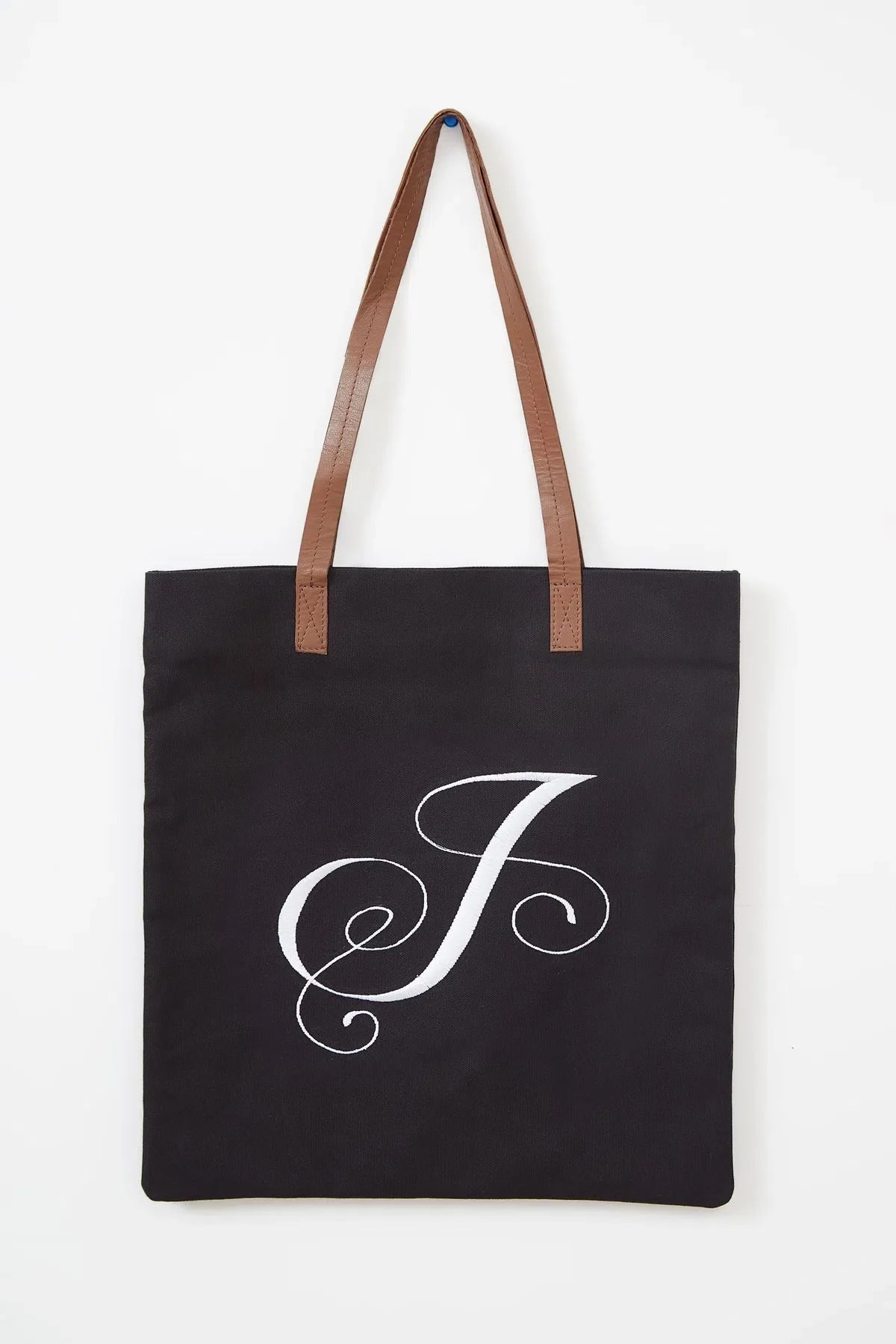 The Cara Letter Canvas Tote Bag features heavy-duty cotton construction and buttery leather straps for long-lasting durability. The front is adorned with an elegant embroidered letter of your choice in an italic font, adding an eye-catching flourish. Perfect for upping your fashion game or gifting someone special.