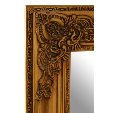 The Carly wall mirror features a wooden frame in a luxurious gold colour and accentuating the carved motifs. The mirror can be displayed in landscape or portrait above a mantel.