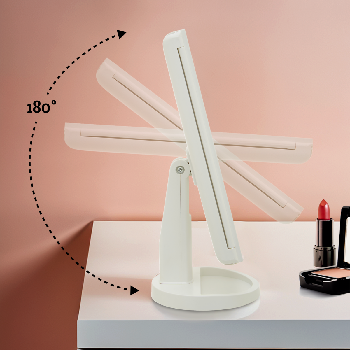 The black tri-fold pannel mirror has one main panel and two foldable sides. The main mirror has a LED light stripe along the border which is activated by a touch sensor. The round base keeps the mirror stable and allows smooth rotation.