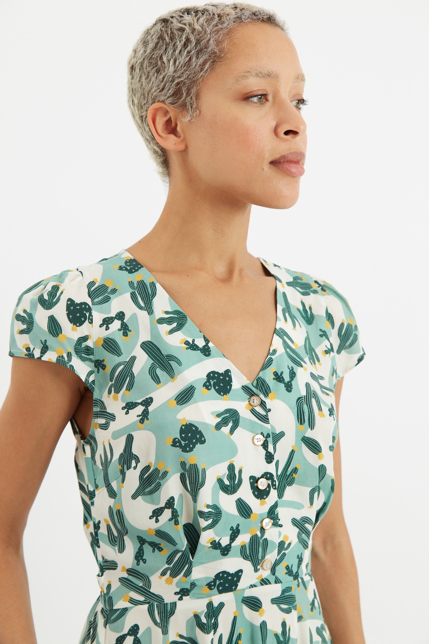 Inspired by a vintage tea dress, our favourite Cathleen dress will serve you well for seasons to come. Crafted in our unique Arizona print, this style is simply the most flattering shape ever. Featuring cap sleeves, a fitted bodice with gold edged buttons, back tie waist to customise your fit and of course those deep side seam pockets we all truly love. Style with cowboy boots or trainers and let her be your forever dress.