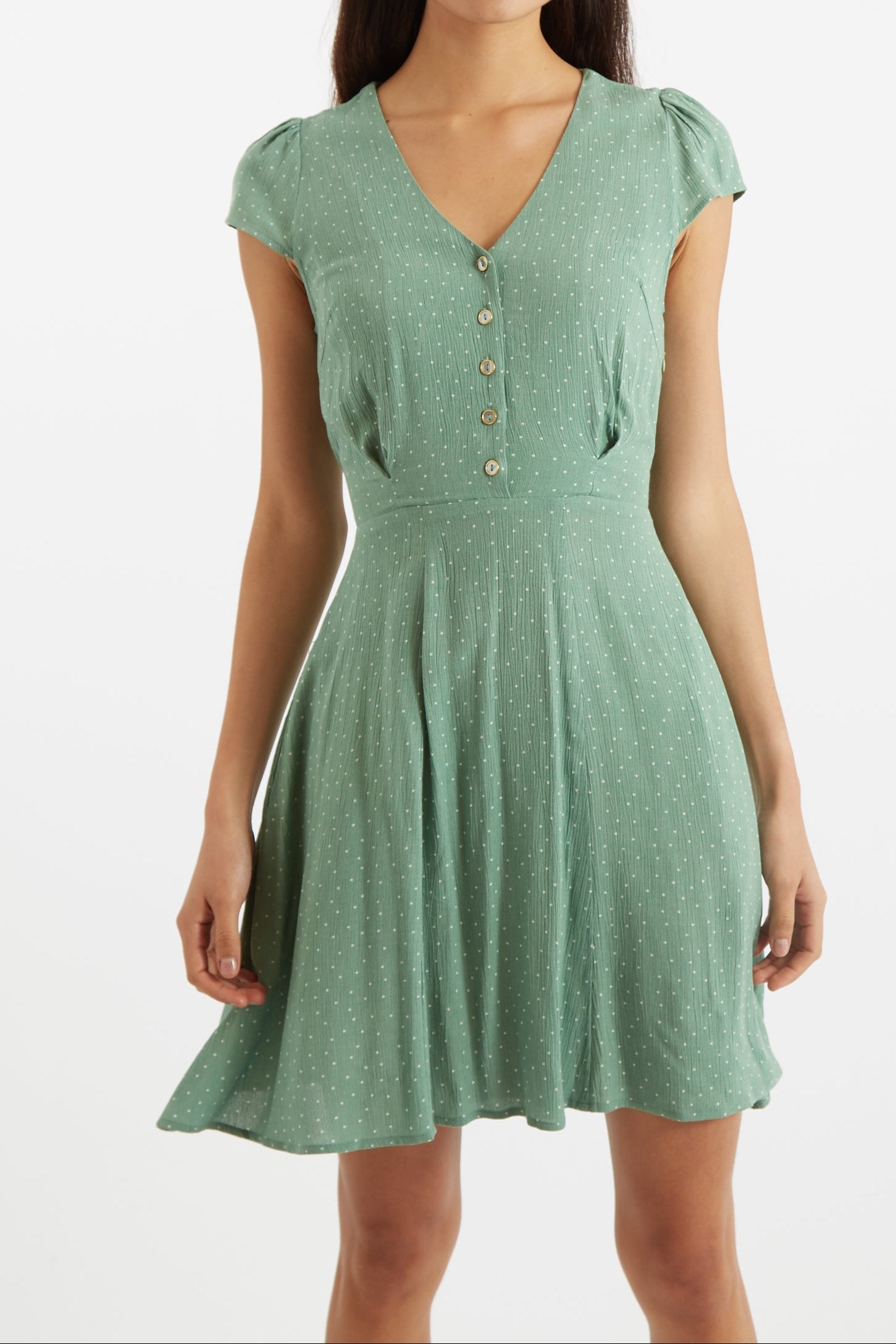 Inspired by a vintage tea dress our favourite Cathleen dress will serve you well for seasons to come. This shape is simply the most flattering shape ever. Crafted in a mint green crepe printed with tiniest dot. Featuring cap sleeves, a fitted bodice with gold-edged buttons, a back tie waist to customise your fit and of course those deep side seam pockets which we all truly love. Style with sandals or trainers and let her be your forever dress.