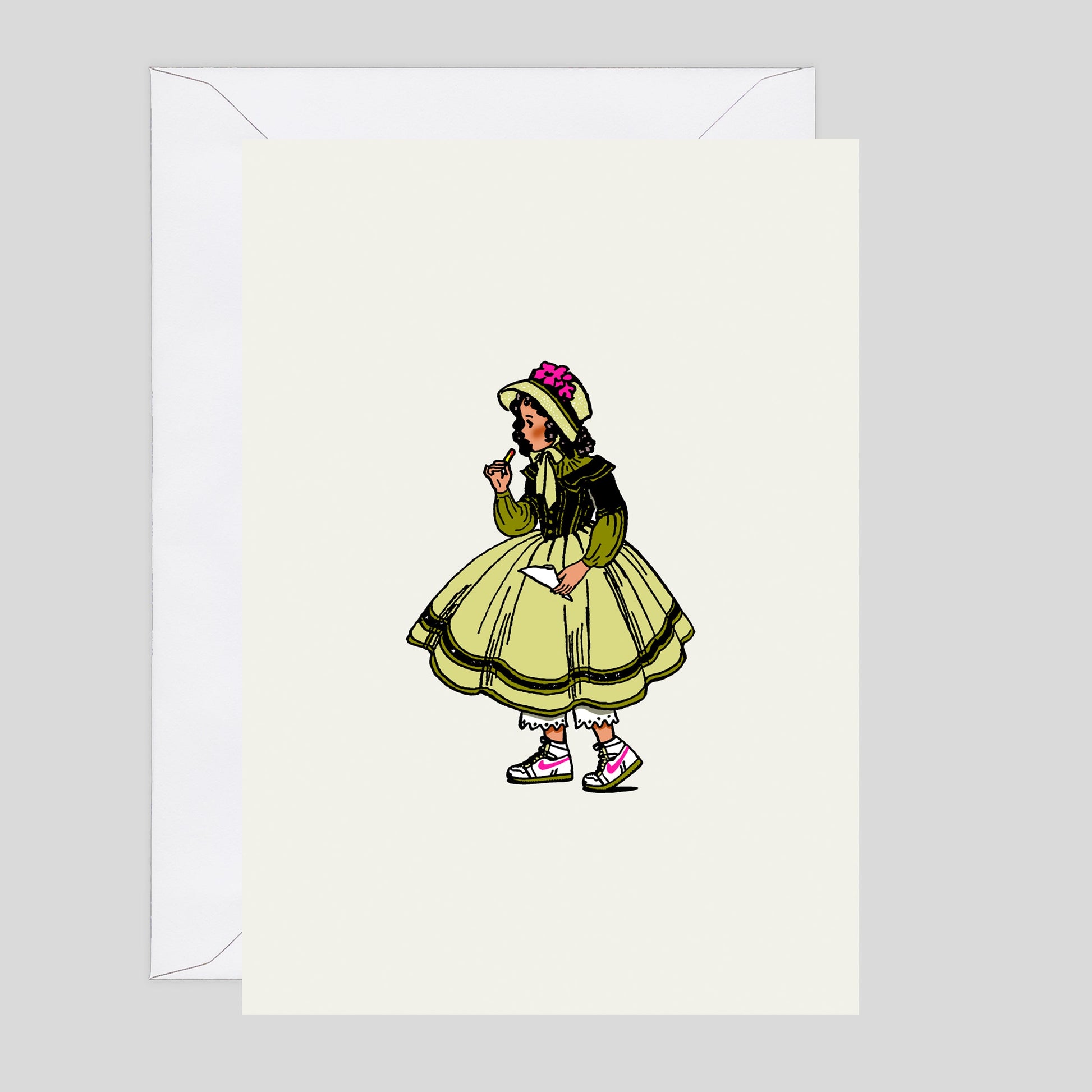 Ceal Warnants' greetings cards play on quaint British illustration pastiches, mixing them up with darkly comic modern insignia, from Nikes to the middle finger.