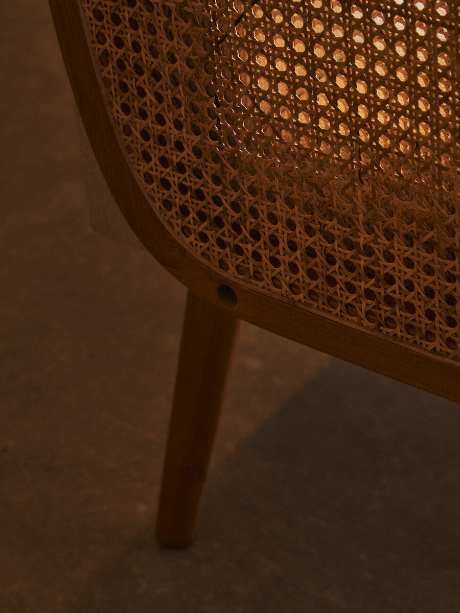 The Cebu 2-seater sofa has a natural-toned beech wood frame that highlights its grains. The design features a gently curved back and armrests. The sides of this sofa are detailed with panels of natural cane weaving, which provides a beautiful, airy contrast to the solid wood and upholstery. The seat and backrest are cushioned and upholstered in linen-effect fabric, creating a warm, comfortable seating experience.