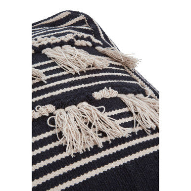 Crafted with a soft yet durable fabric, it features a bold striped pattern in deep hues, accented by intricate knotted details and layers of playful tassels. The textured surface adds depth and visual interest, making it a standout piece in any room.