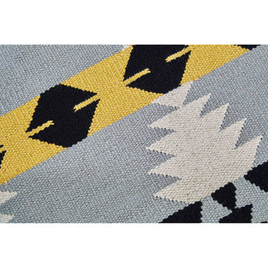 The pattern on this pouffe features geometric motifs, showcasing a texture and colours in shades of black, white, grey, and yellow. The footstool is supported by four sturdy mango wood legs, which have a warm, natural finish. This visually appealing and inviting footstool is perfect for extra seating.