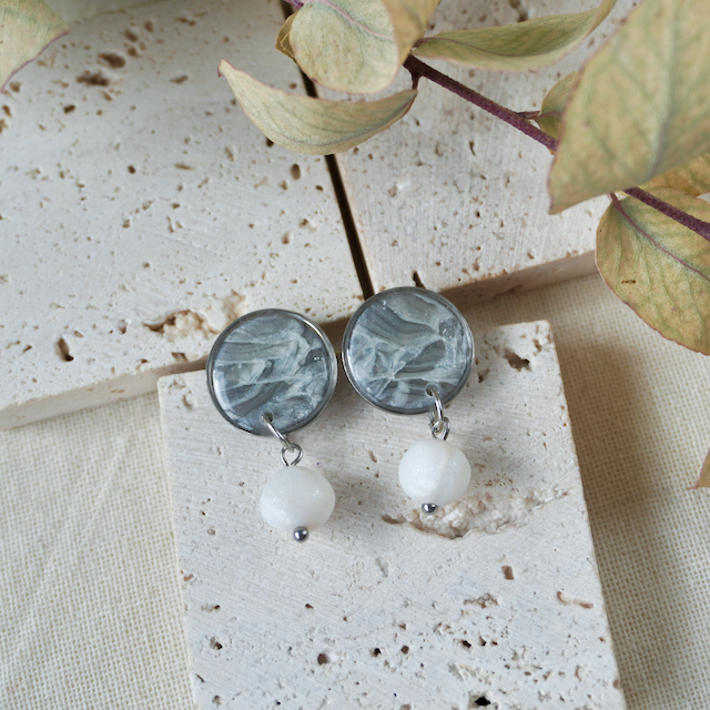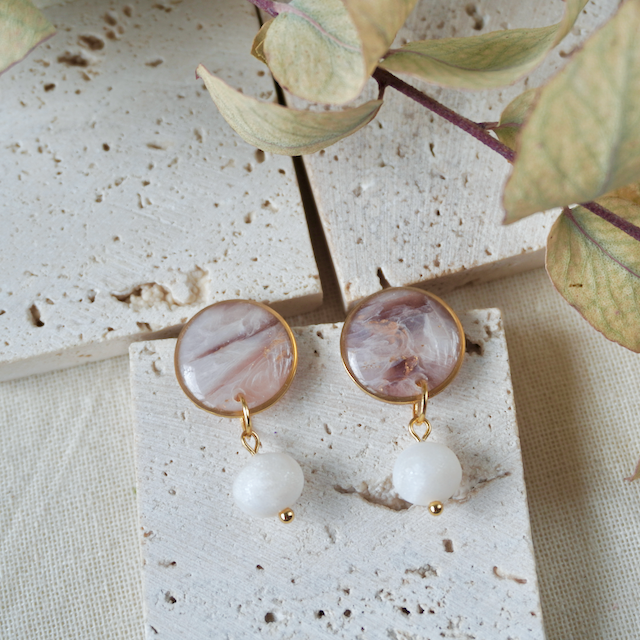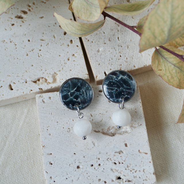 The creative process to craft the unique colour and stone like effect involves a mixture of translucent polymer clay, combined with an array of inks and metal leaf in such a way that achieves a one-of-a-kind finish. To complete the process, it is topped with a transparent resin to really highlight the colour and sparkle!