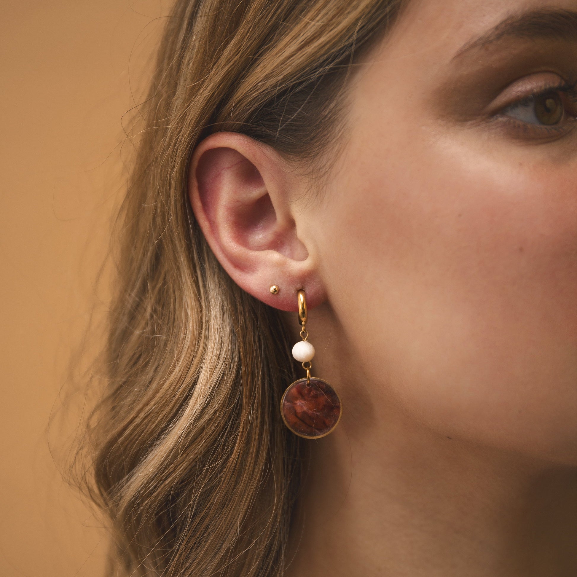 A new and exciting offering from Celestia; a lovely classy mix of a vegan-friendly faux pearl and bright disc of deep colour. This piece pairs perfectly with a necklace like Celestia Duo Pendant.