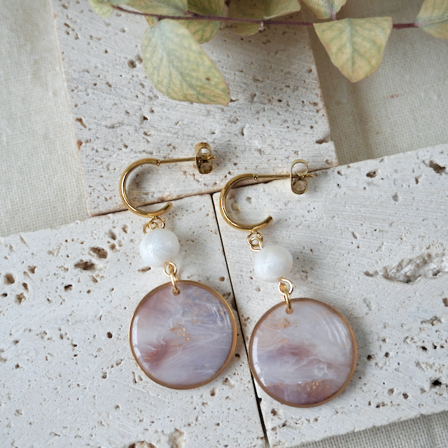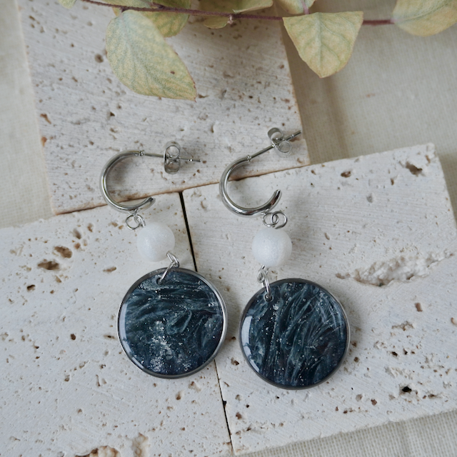 The creative process to craft the unique colour and stone like effect involves a mixture of translucent polymer clay, combined with an array of inks and metal leaf in such a way that achieves a one-of-a-kind finish. To complete the process, it is topped with a transparent resin to really highlight the colour and sparkle!