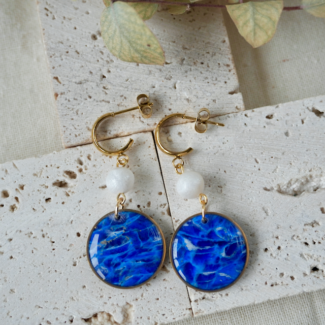 All of our jewellery is crafted by hand, so each has a unique finish making them one-of-a-kind pieces. The colour in the earring glows with vibrancy when the sun hits them.