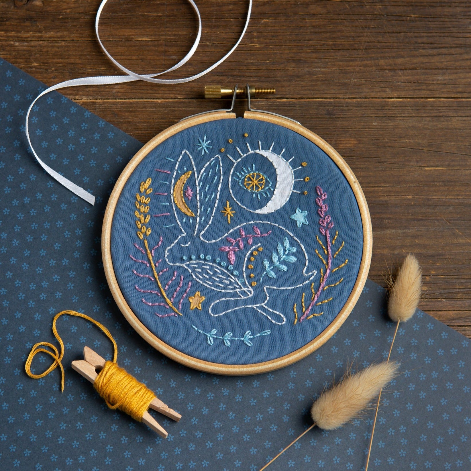 Turn off the noise of the world and get lost in embroidery with the beginner-friendly Celestial Hare mini embroidery kit.