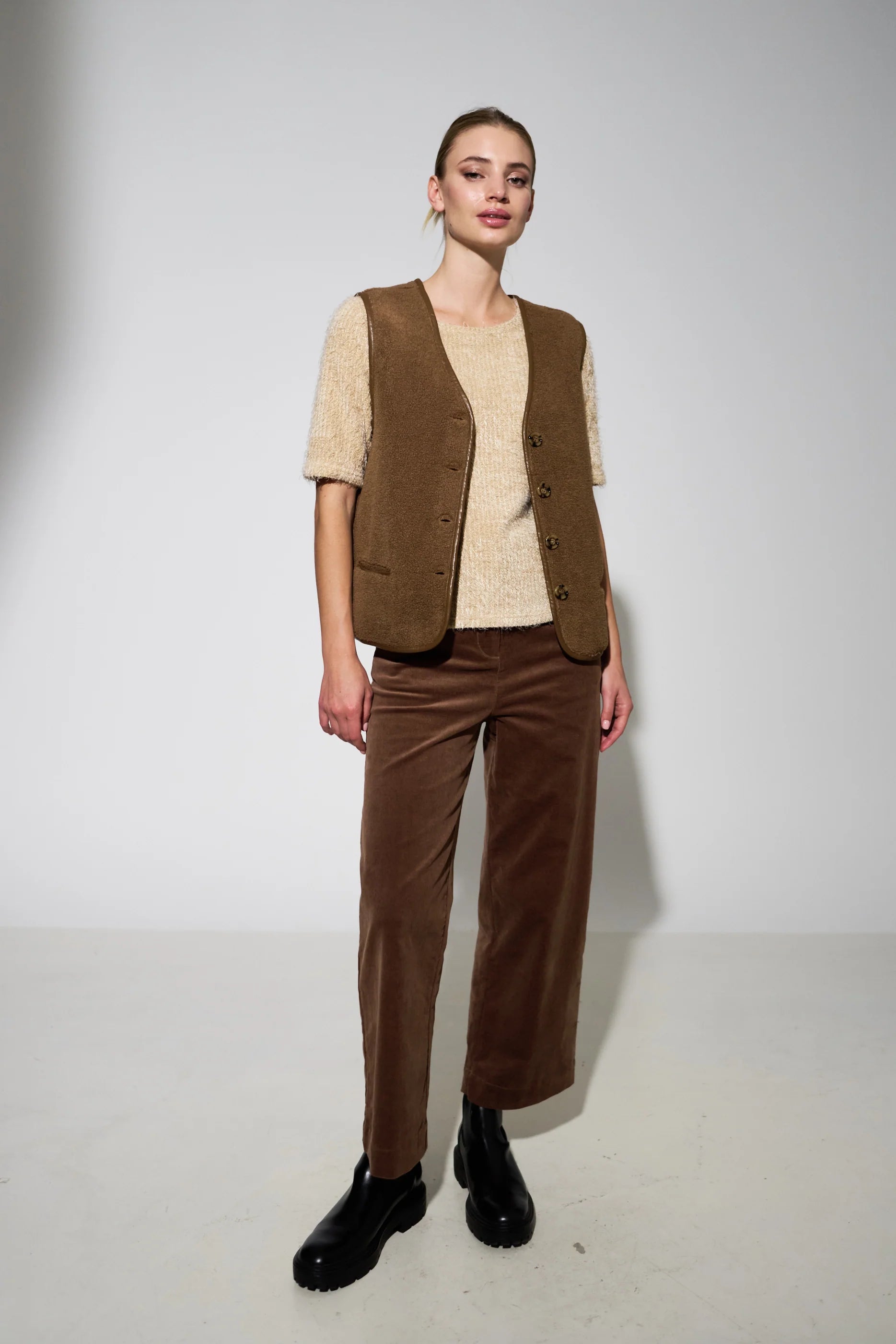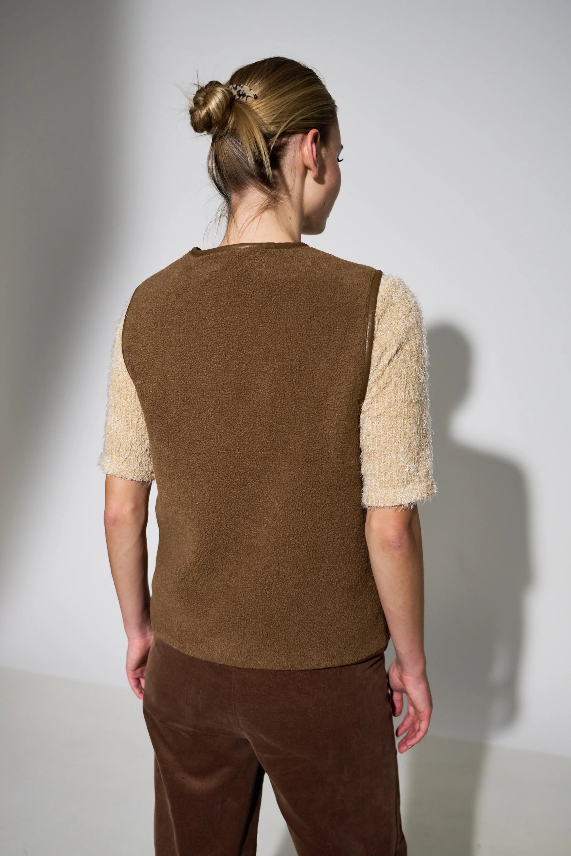 The Chris Borg Waistcoat in nutmeg is a must-have layering piece for the season. Made with soft borg fabric and a premium shot lining, it offers both style and warmth. With faux leather binding for added structure, this gilet effortlessly elevates your look.