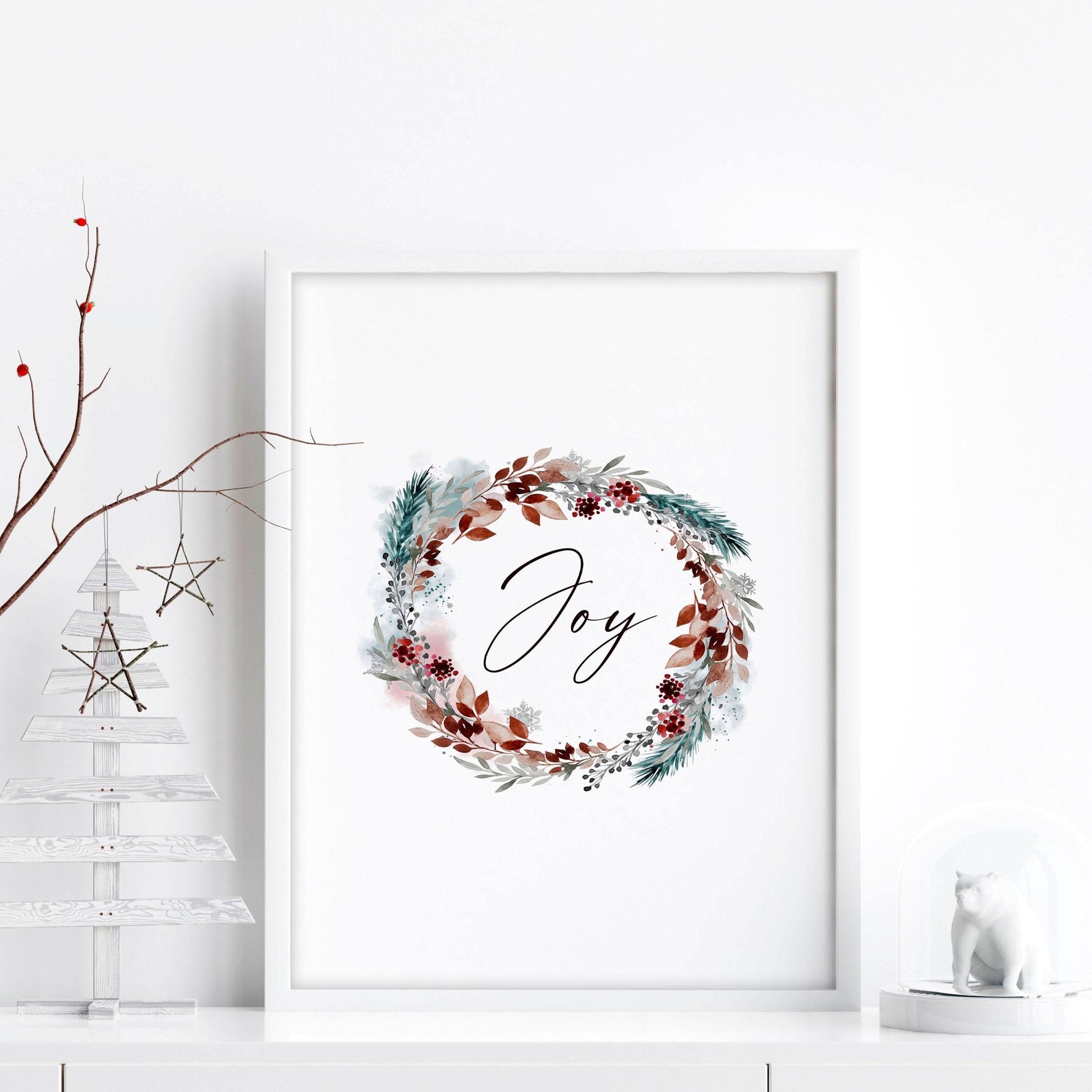 Finally, celebrate the season of joy with our Christmas Wall Art Print. Embrace the beauty of the watercolour wreath and let the handwritten "Joy" word remind you of the true spirit of Christmas. Bring a smile to your face and create a welcoming atmosphere in your home. Order your wall art print today and embrace the joy of the holiday season.