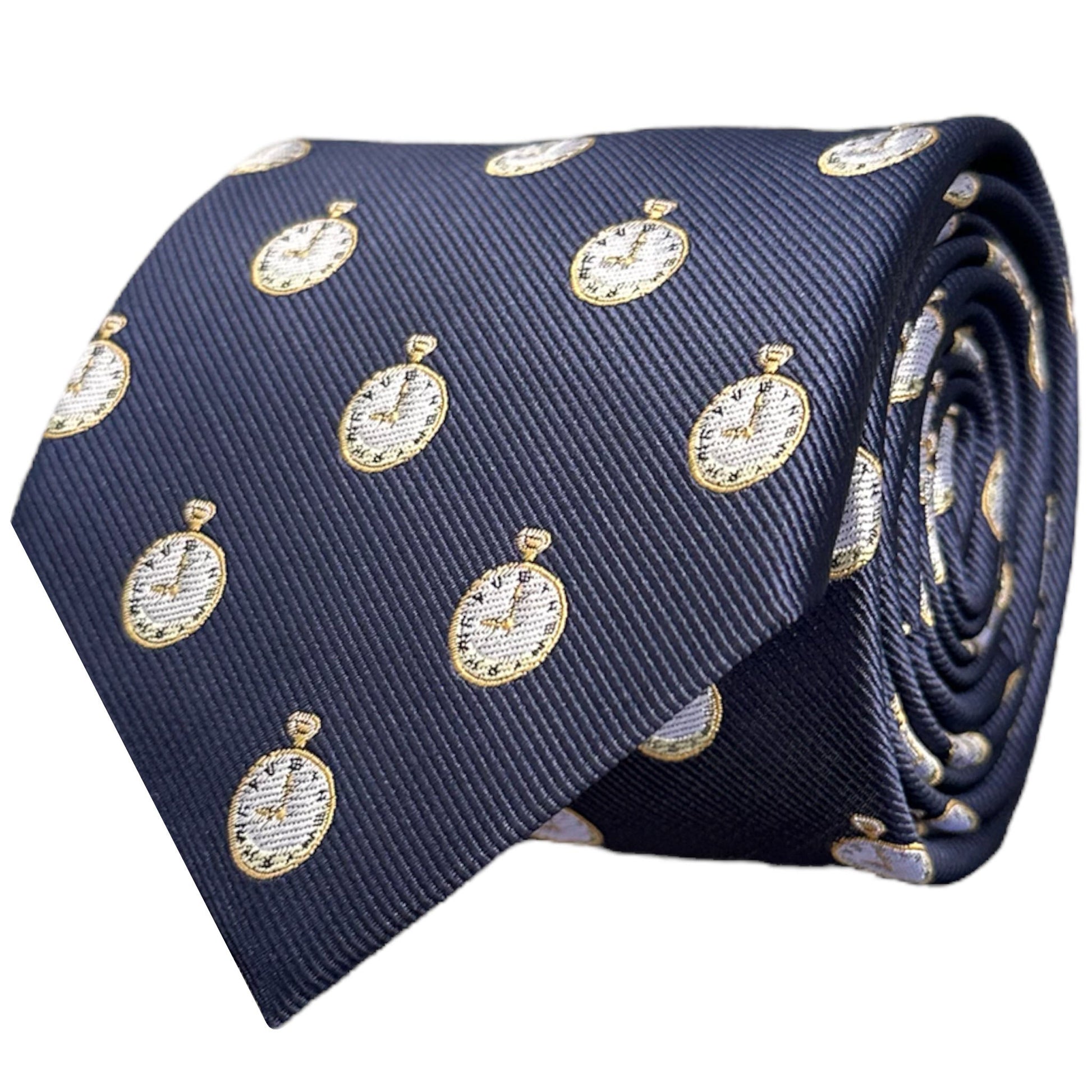 A timeless blue necktie adorned with gold pocket watch embroidery, blending classic elegance with vintage charm.