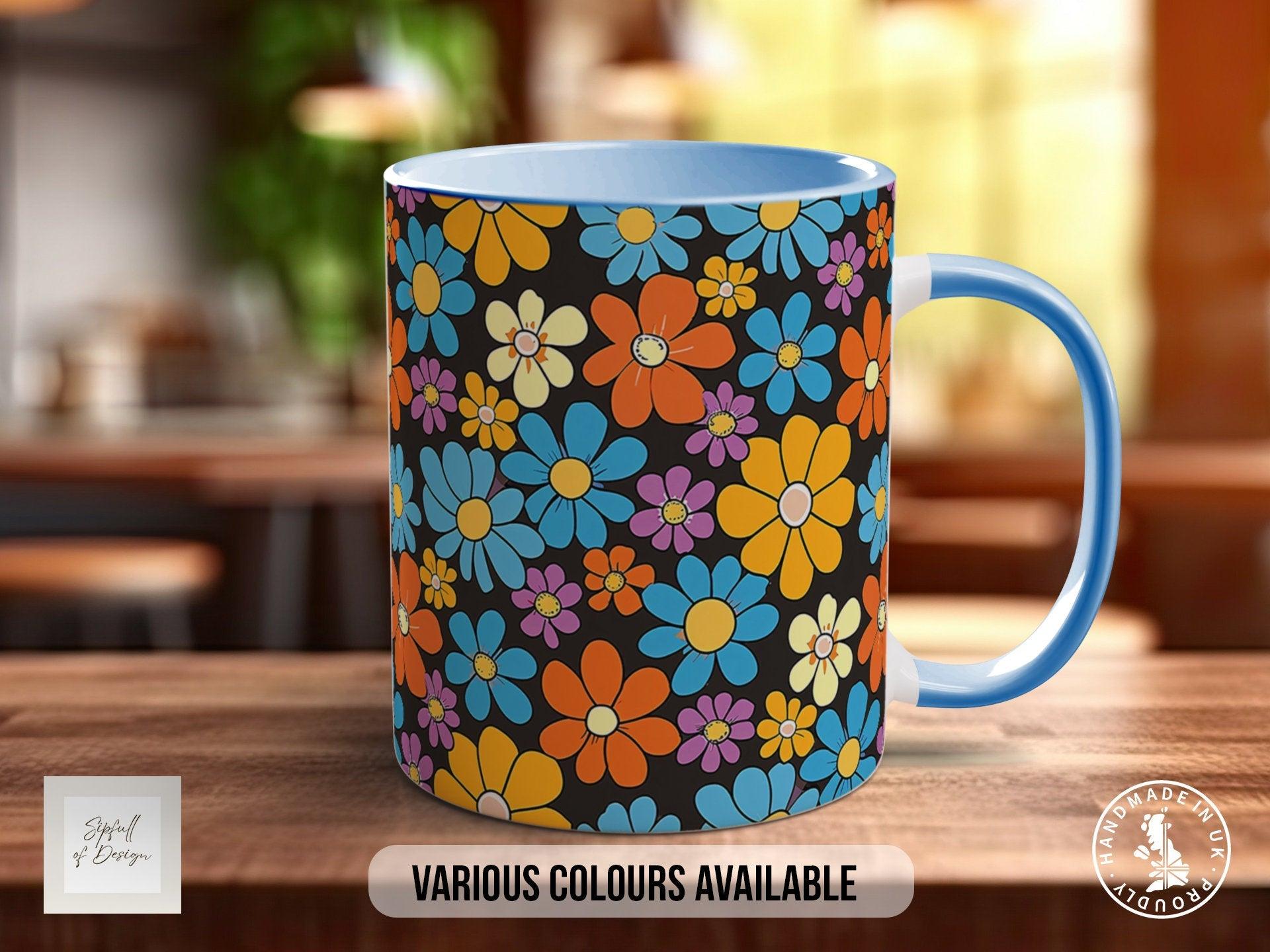 The Coloured Groovy Flowers Full Wrap Art Mug - Design 12 brings a cheerful splash of colour to your daily tea or coffee ritual. Handmade with care in our Sussex studio, this 11oz mug features a vibrant floral wrap-around design that adds a warm, groovy charm to your kitchen. Crafted on premium ORCA stock, it offers durability for everyday use with a stunning finish that lasts through 800 wash cycles. The dishwasher-resistant print comes with a 1-Year Print Guarantee, ensuring your favourite design stays bright and beautiful sip after sip.