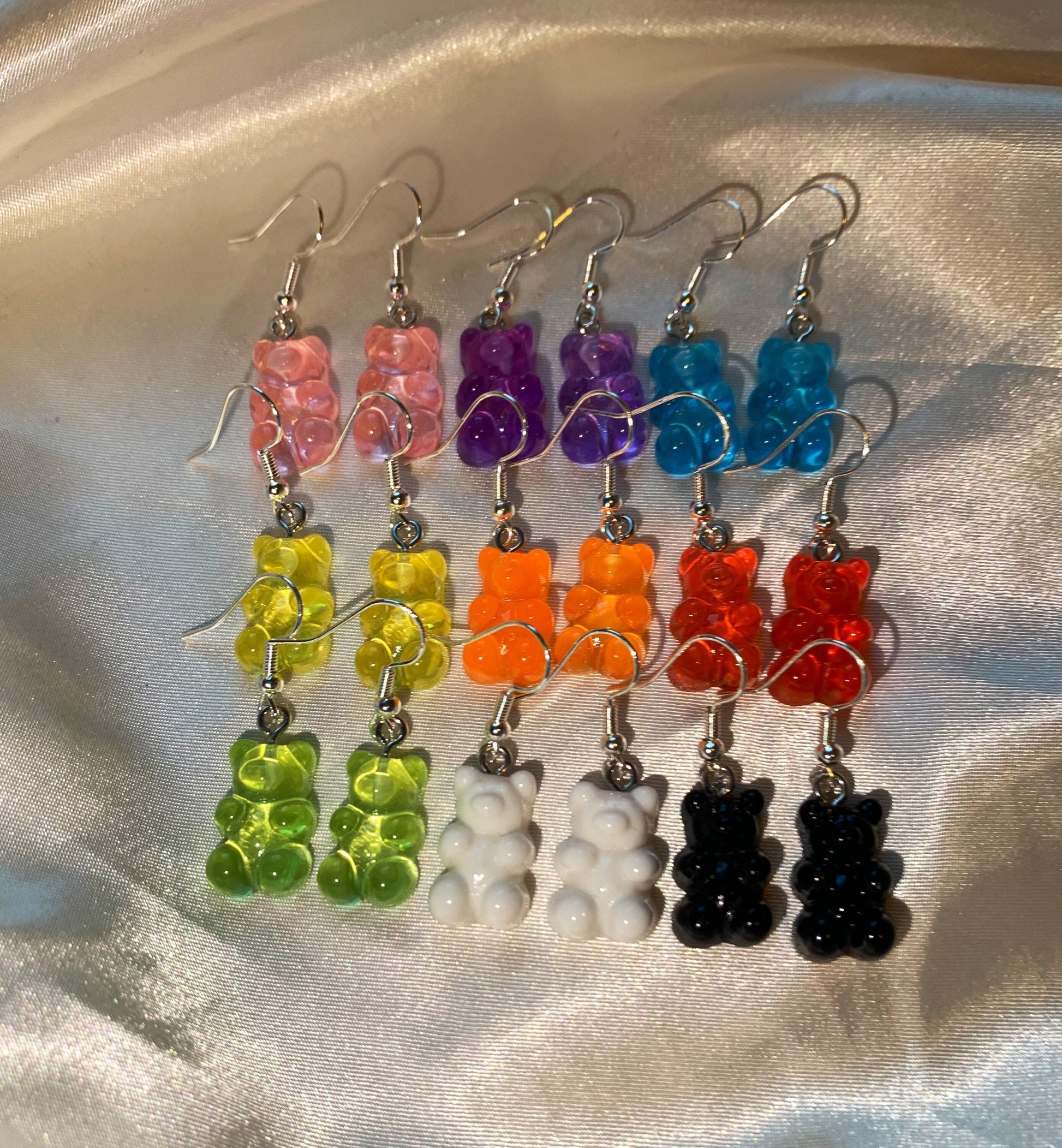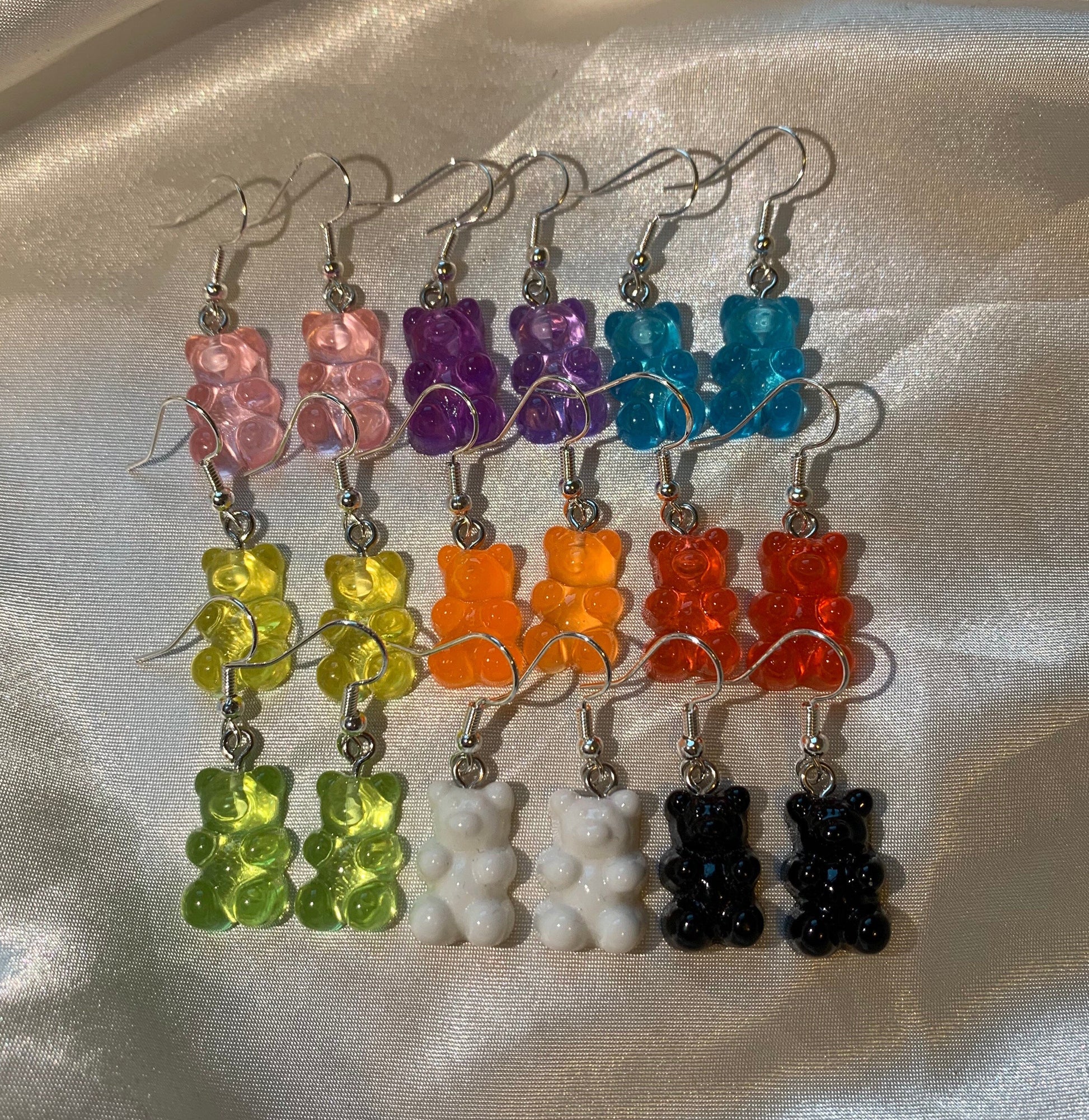 A pair of handmade, silver plated, quirky jelly baby bear earrings. There is a wide range of colours available in the shop.