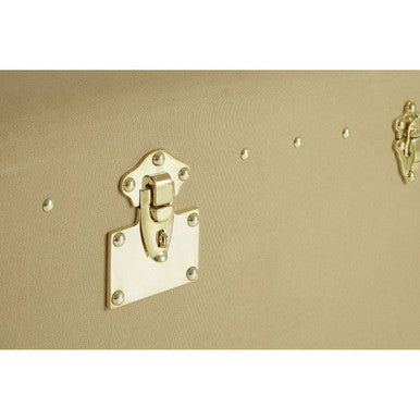 The studded edging and clasp-lock hardware nod to vintage travel trunks, adding authentic charm without compromising on function.