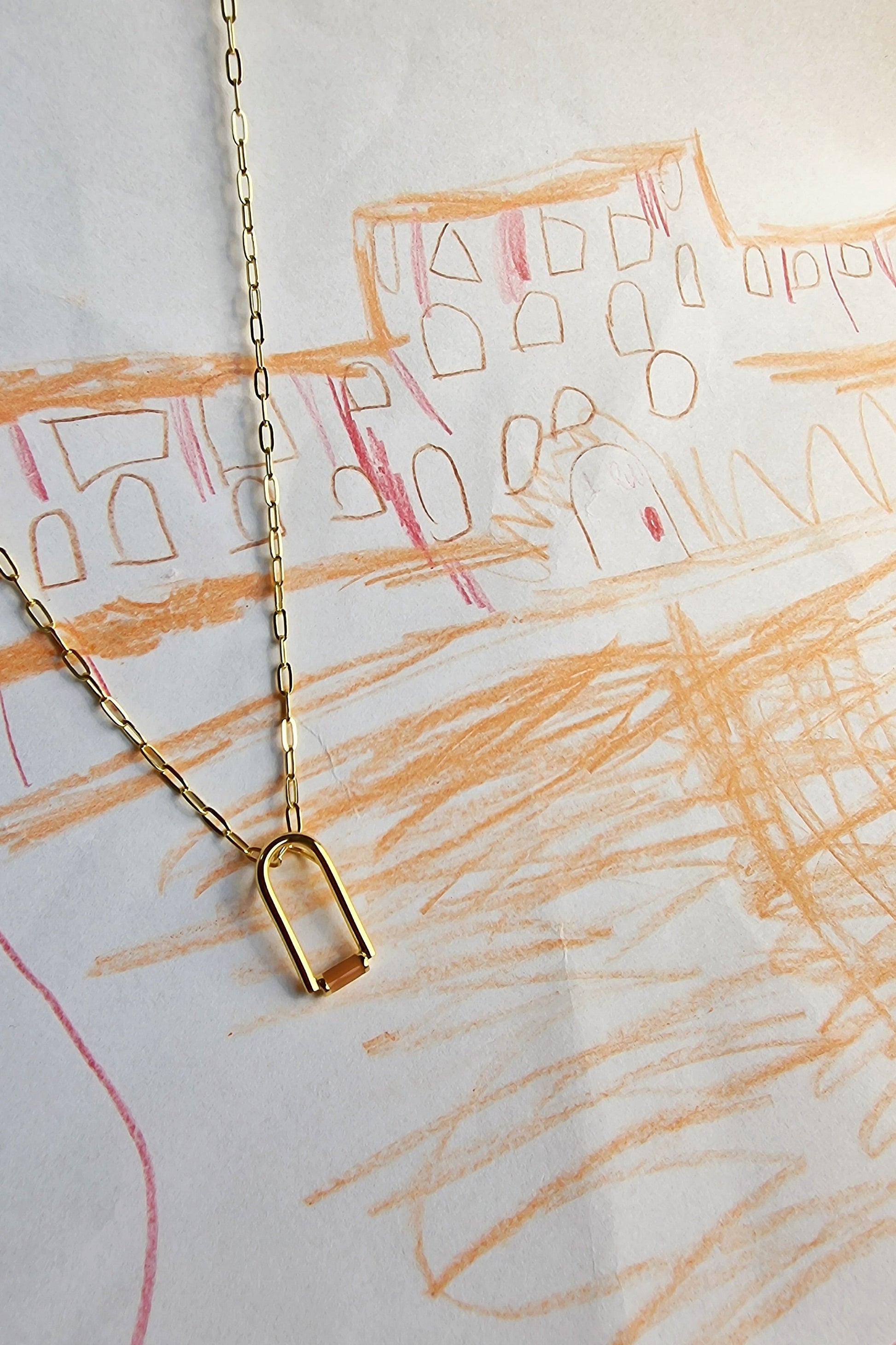 A golden arch pendant crafted with neutral enamel - it's all inspired by a child's drawing from Somalia, so you know it's special. Let the unique design of this necklace speak for itself. It'll be sure to catch eyes!