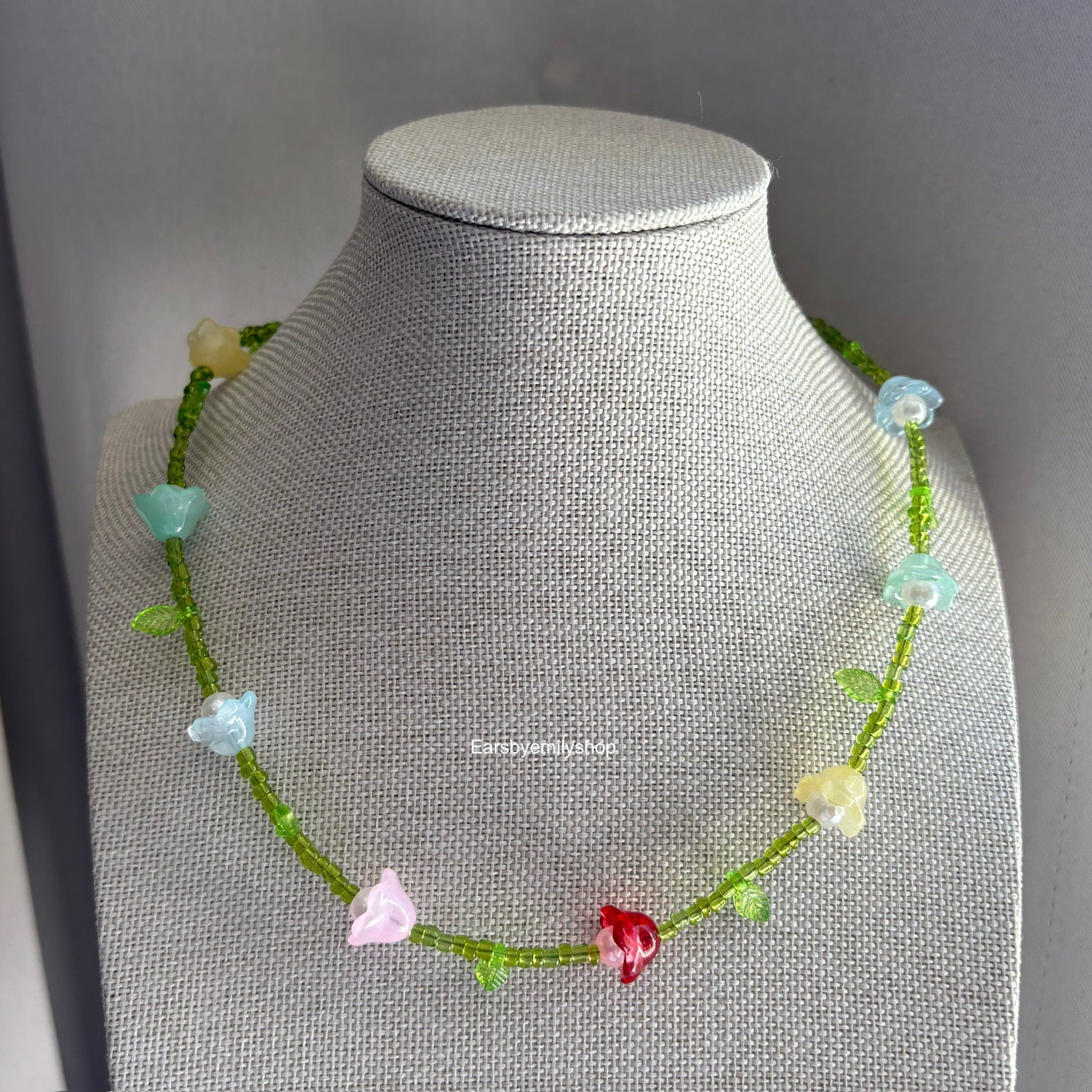 A cool handmade beaded floral necklace! We have designed this piece to resemble a vine with colourful flowers.