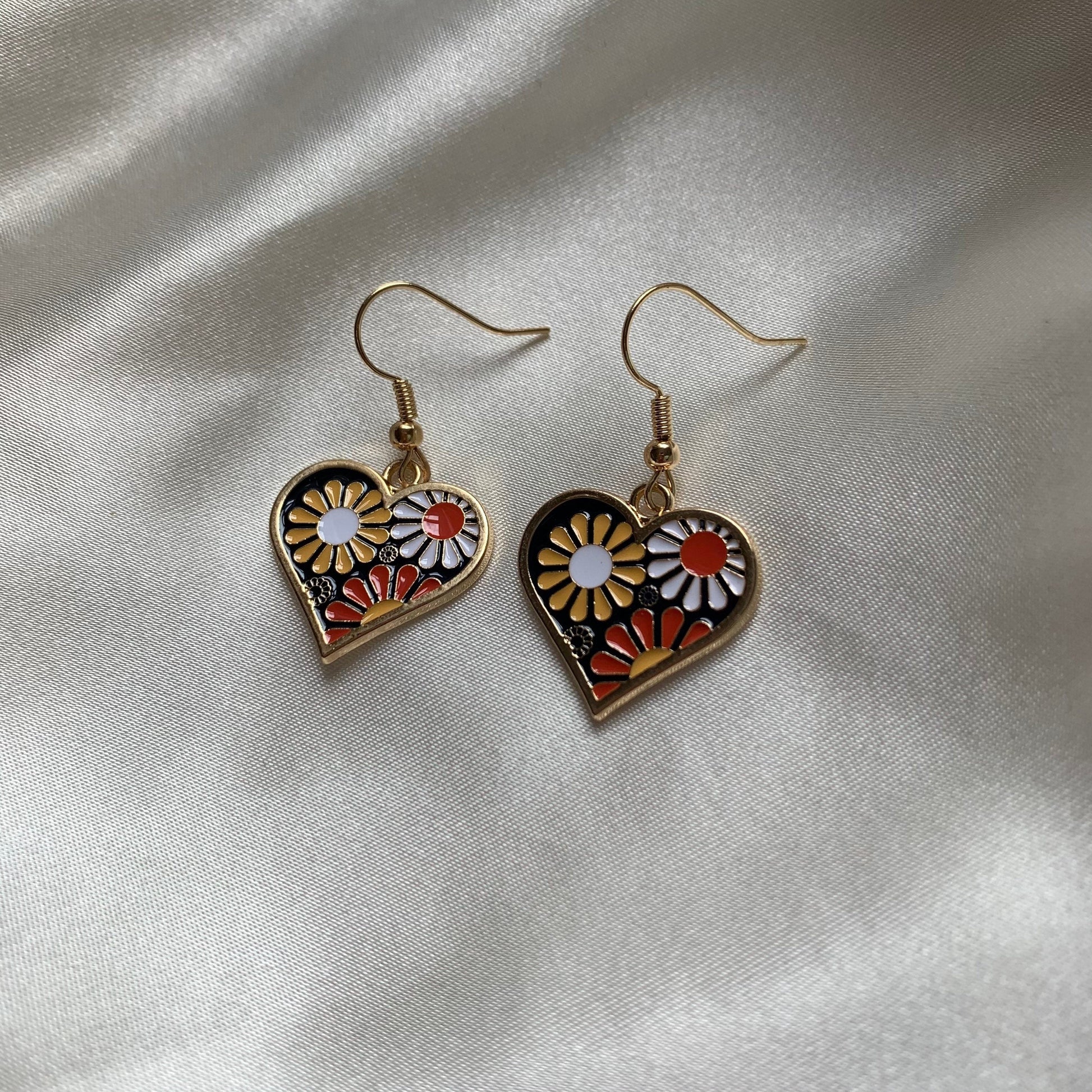 Cool quirky colourful flower in heart gold drop dangle earrings