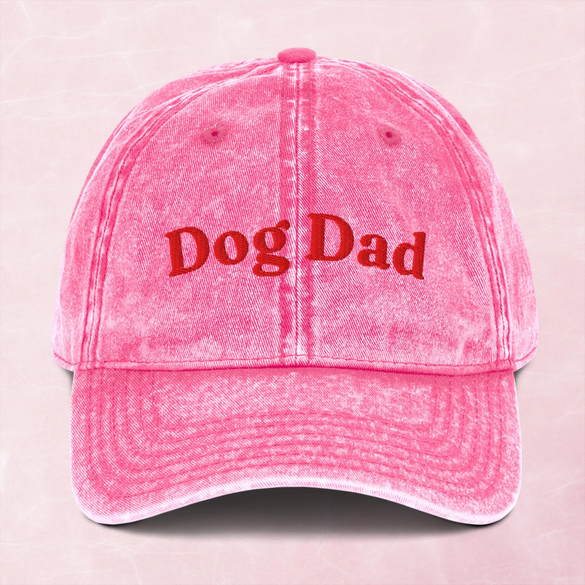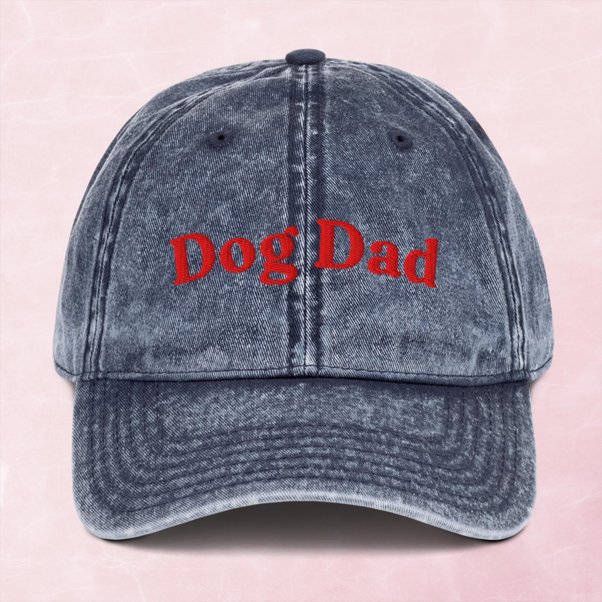 A cool embroidered 'dog dad' unisex cap on a washed out vintage effect cap.