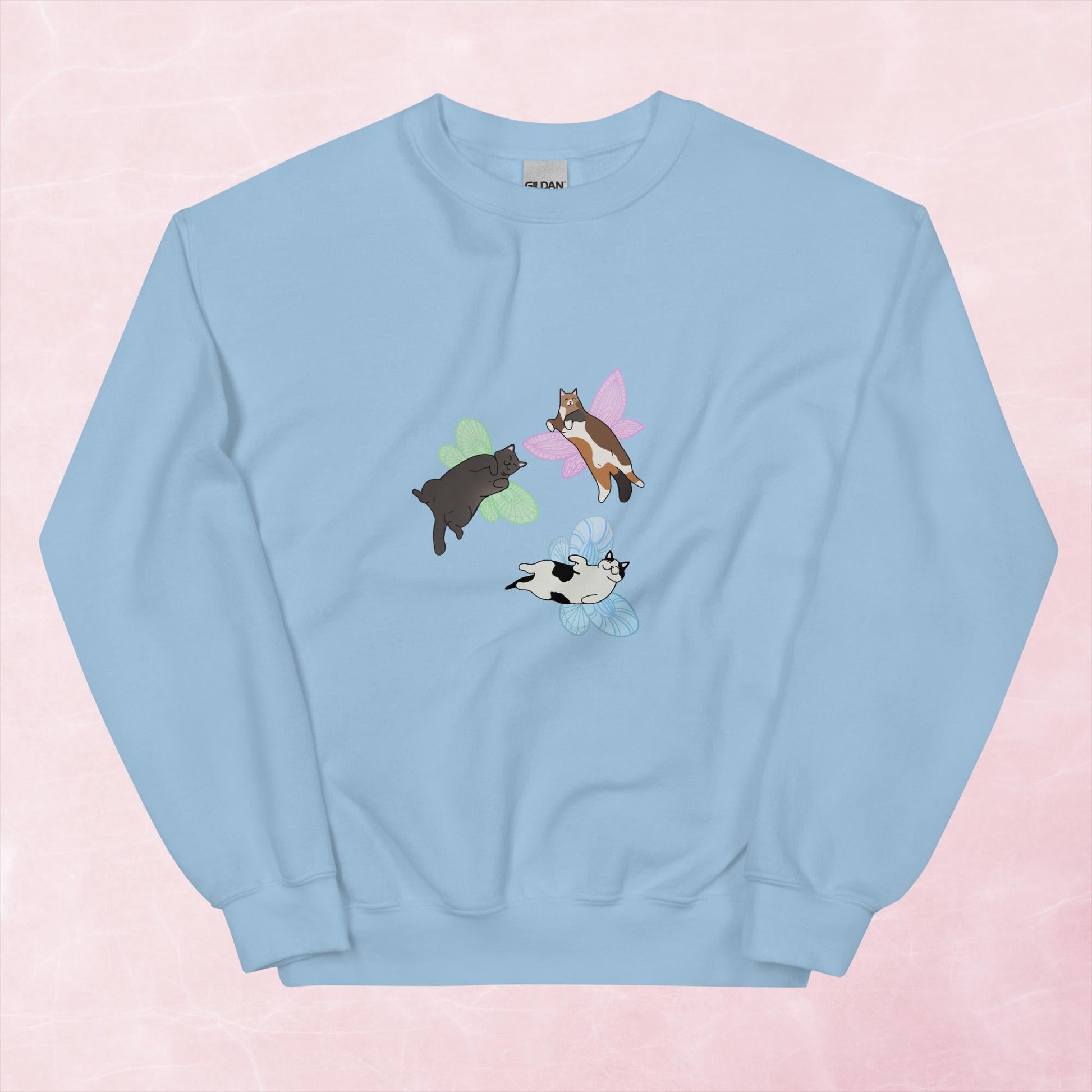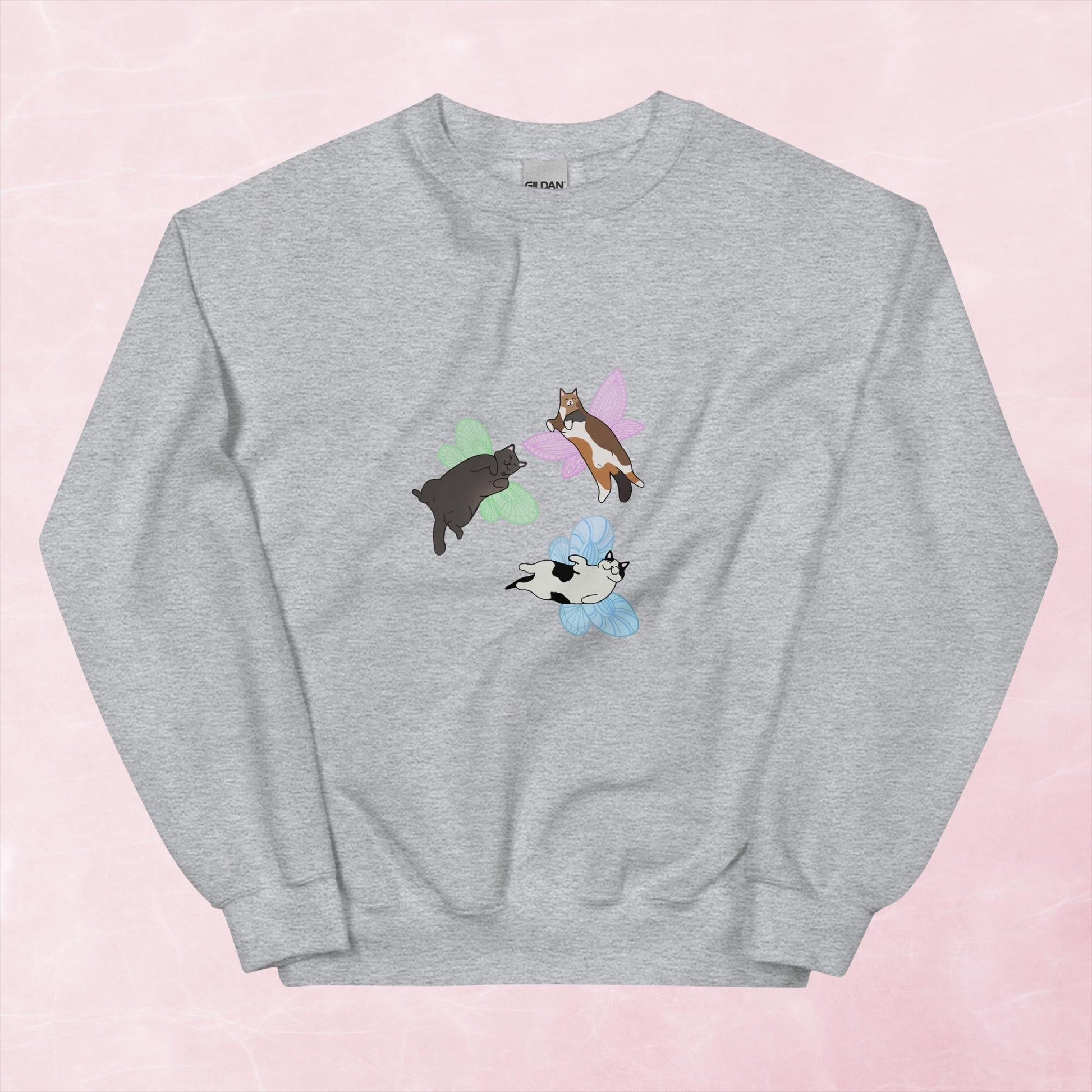 A sturdy and warm sweatshirt featuring a fun hand illustrated fairy cat trio. Great for keeping you warm in the colder months. All designs are made by us here at Ears by Emily, and the copyright for this is reserved to us.