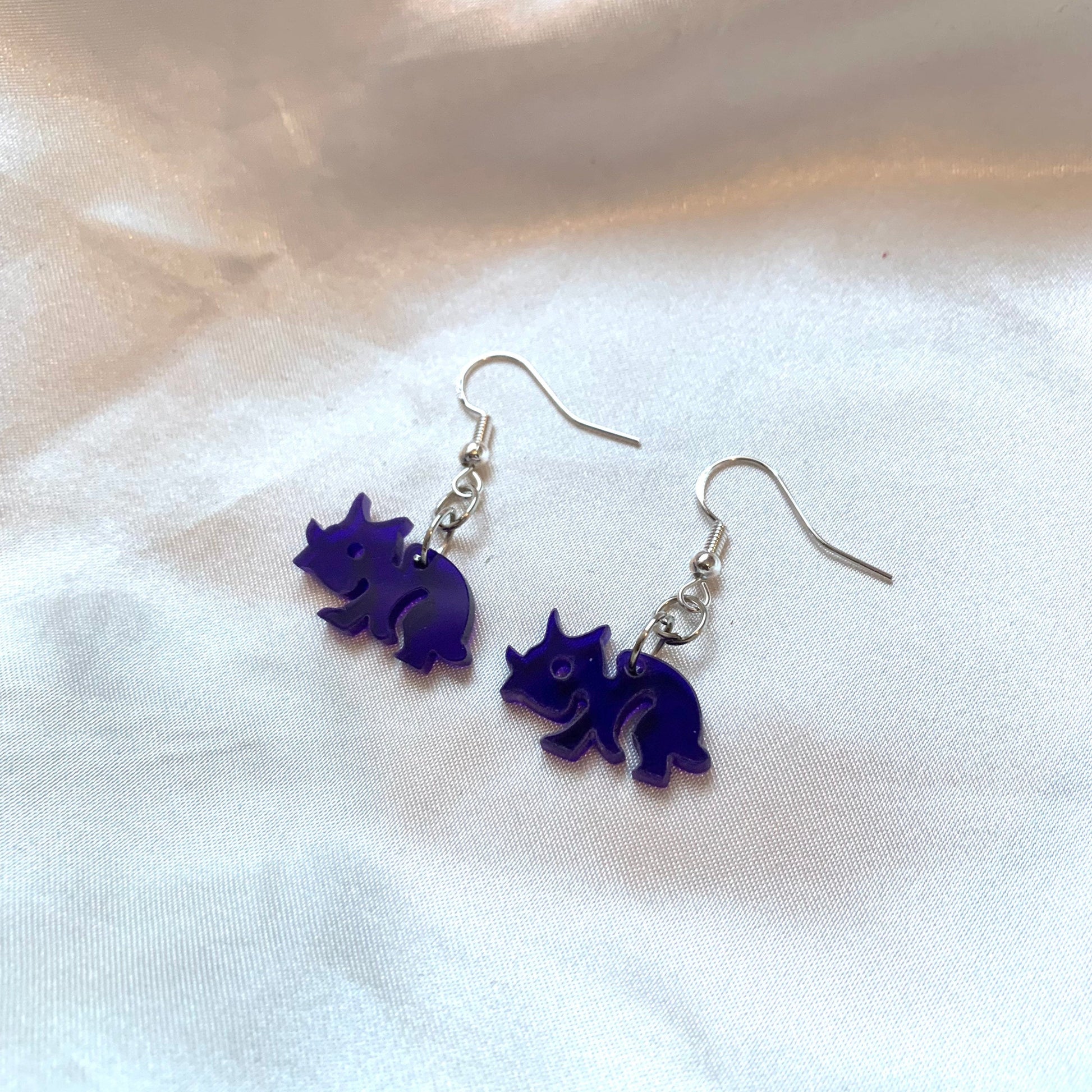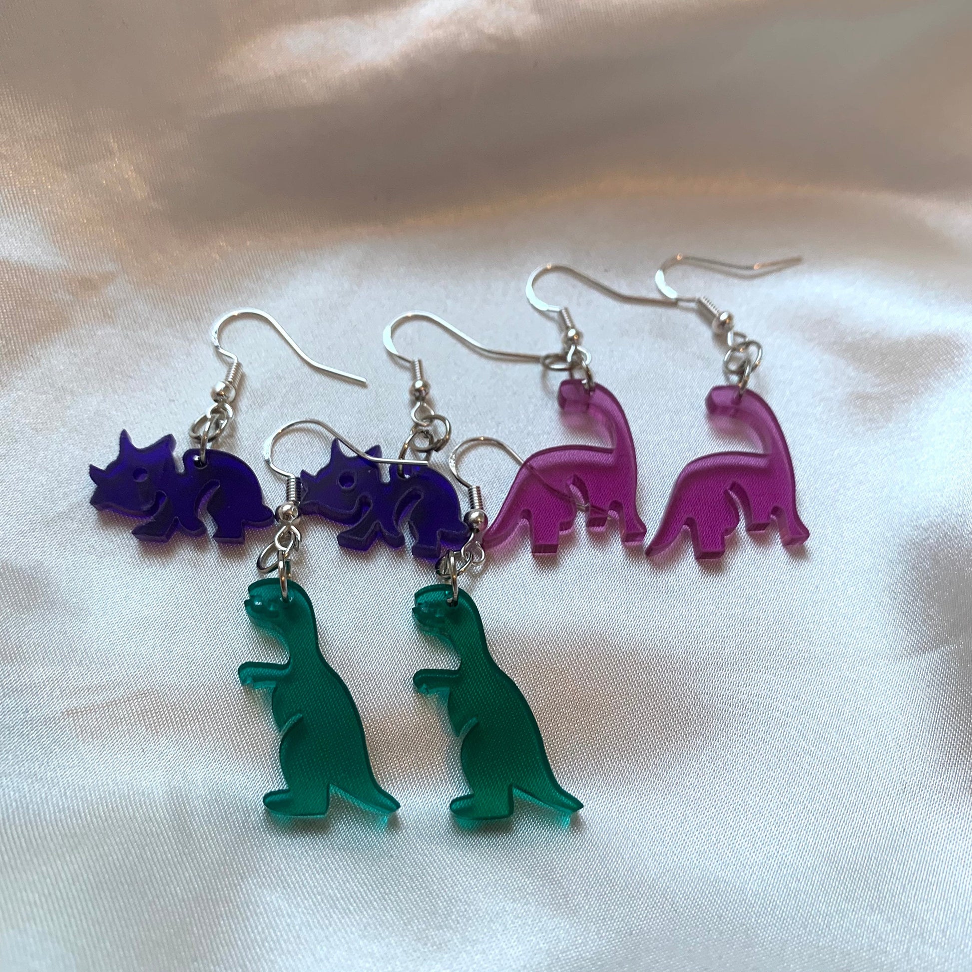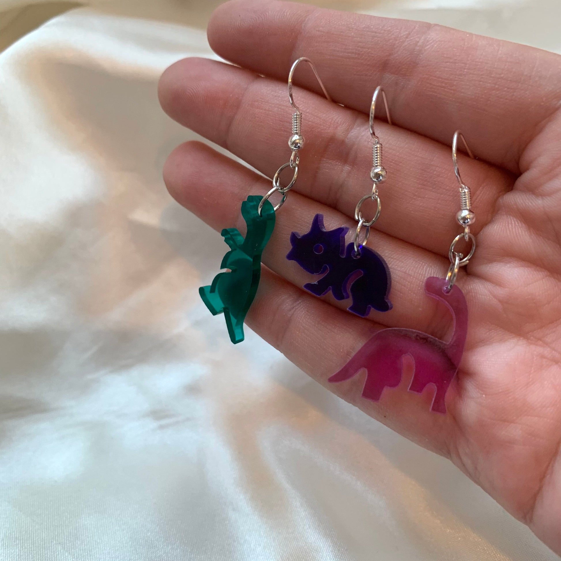 Cool quirky fun colourful acrylic dinosaur handmade drop dangle earrings on silver plated hooks
