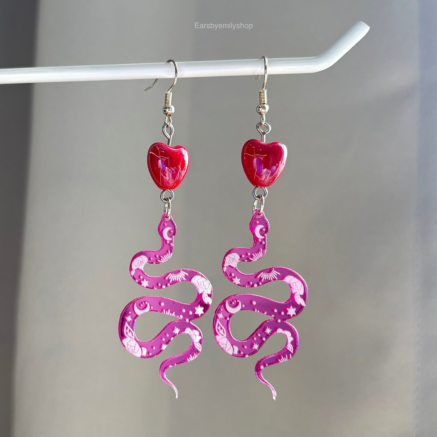 Cool quirky large statement pink acrylic snake earrings with ceramic red heart handmade drop dangle silver plated earrings
