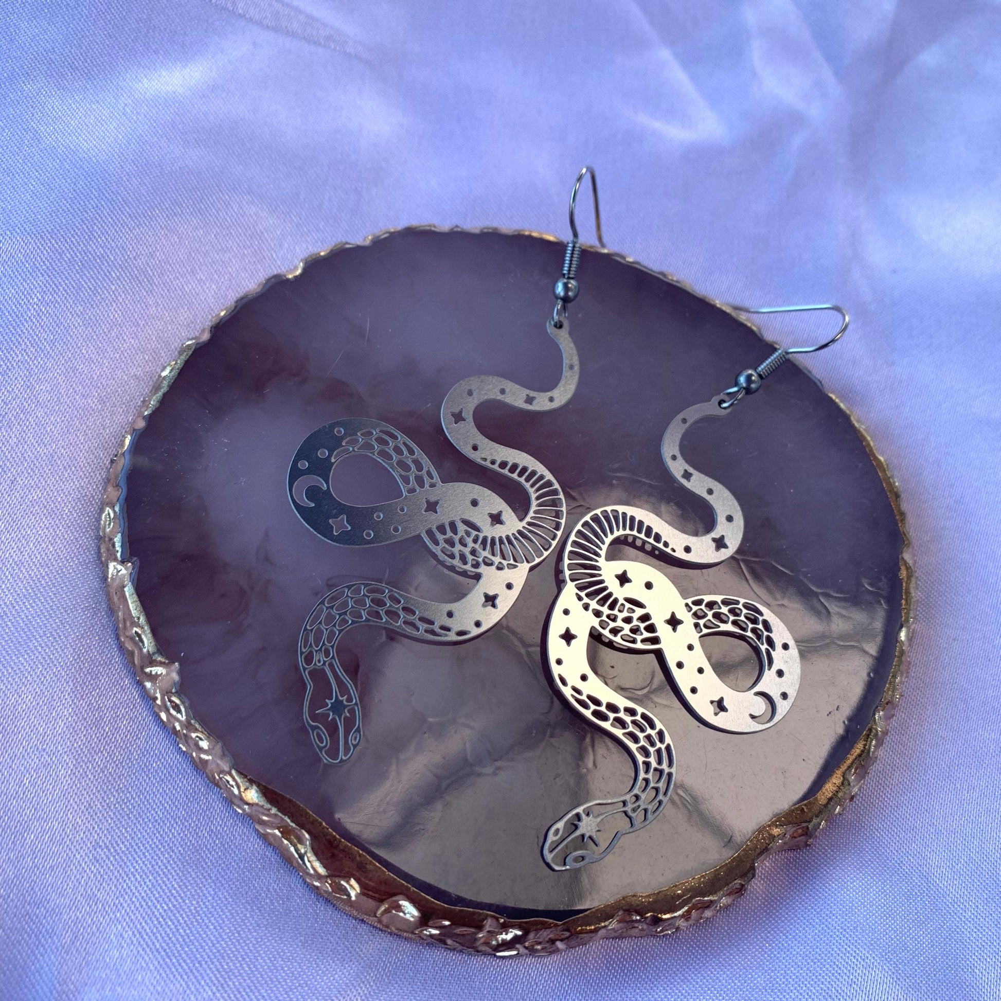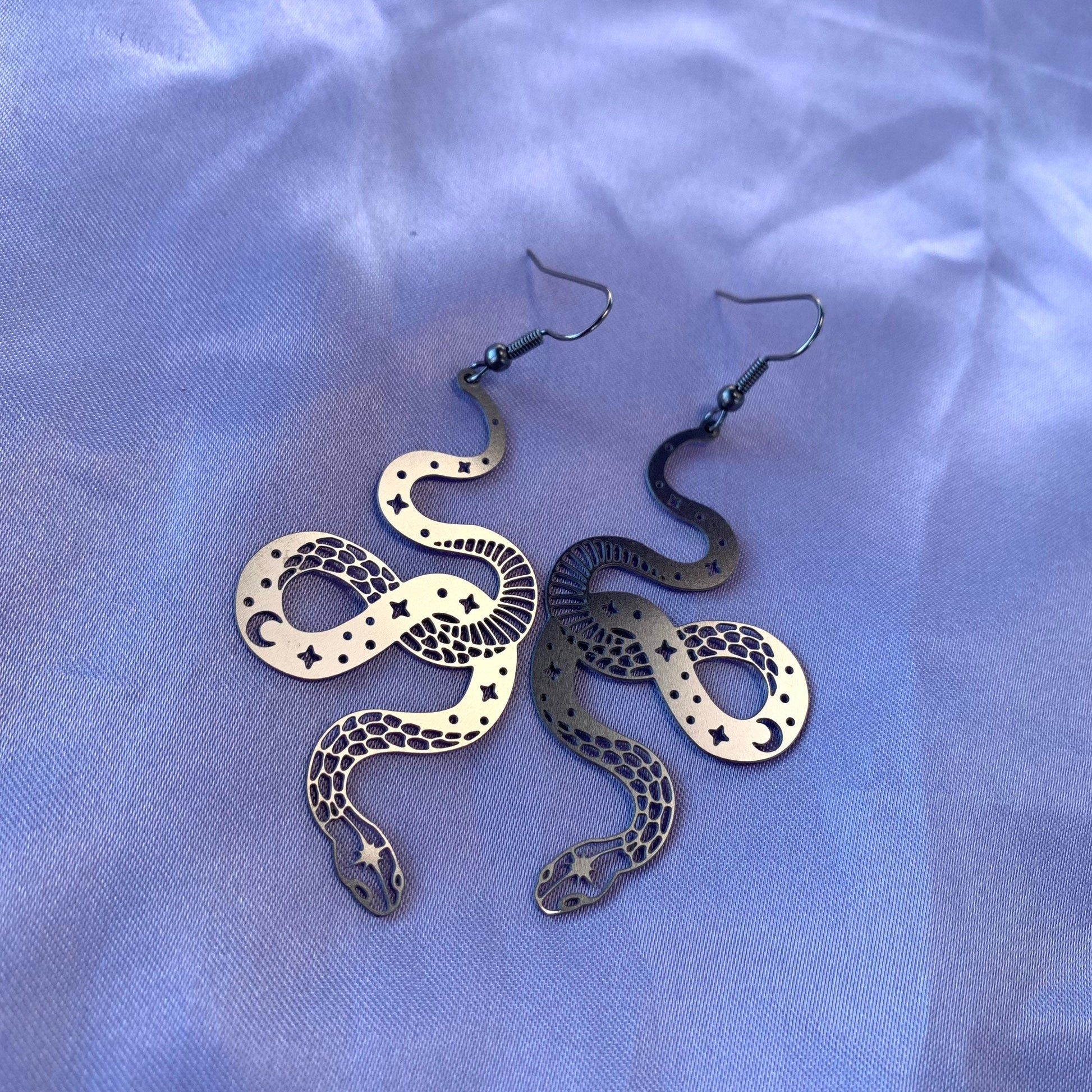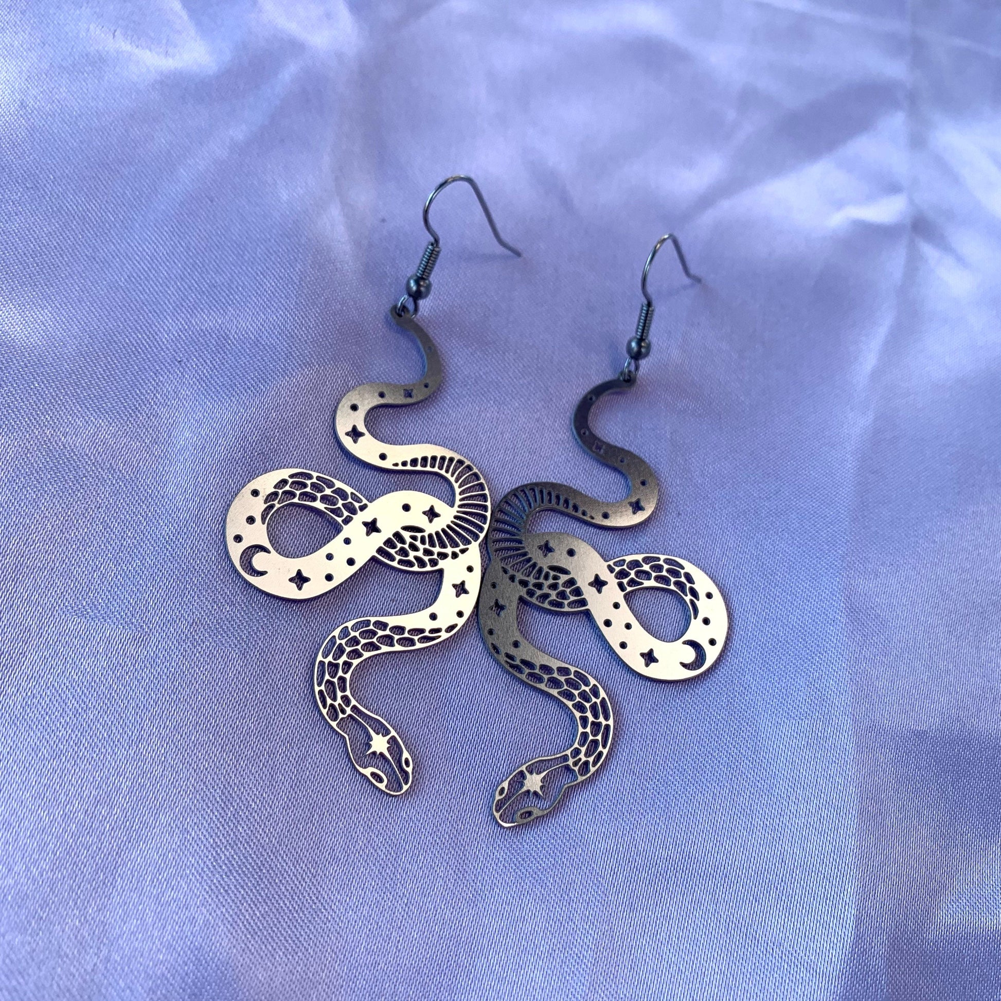 A cool pair of silver celestial snake earrings.