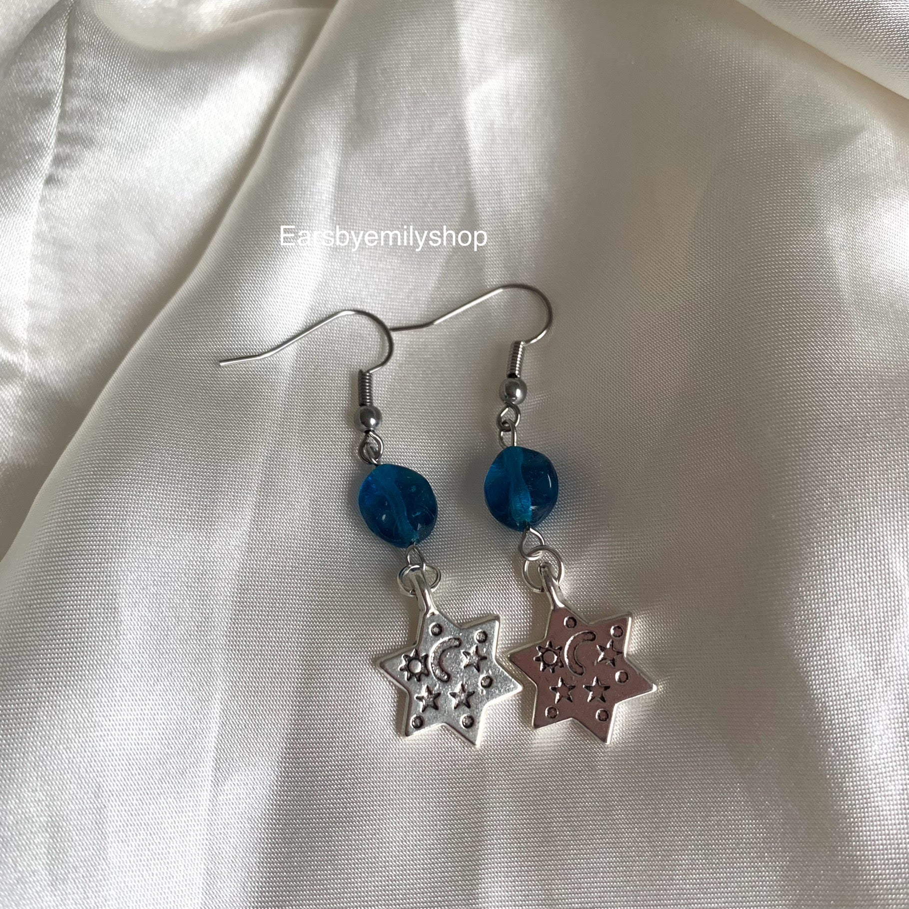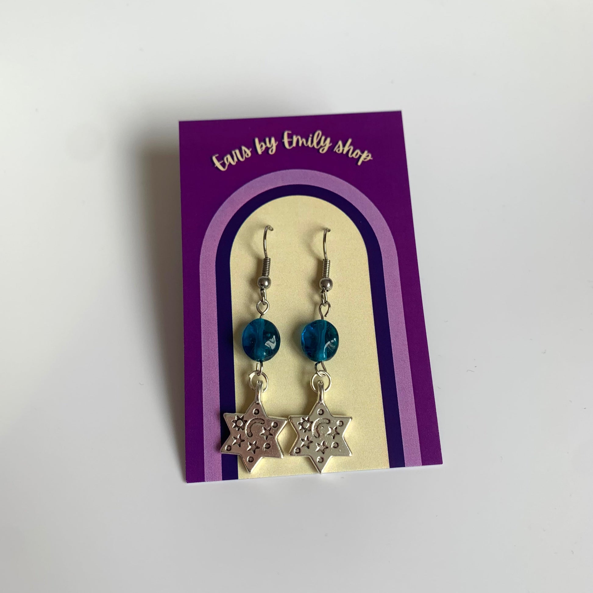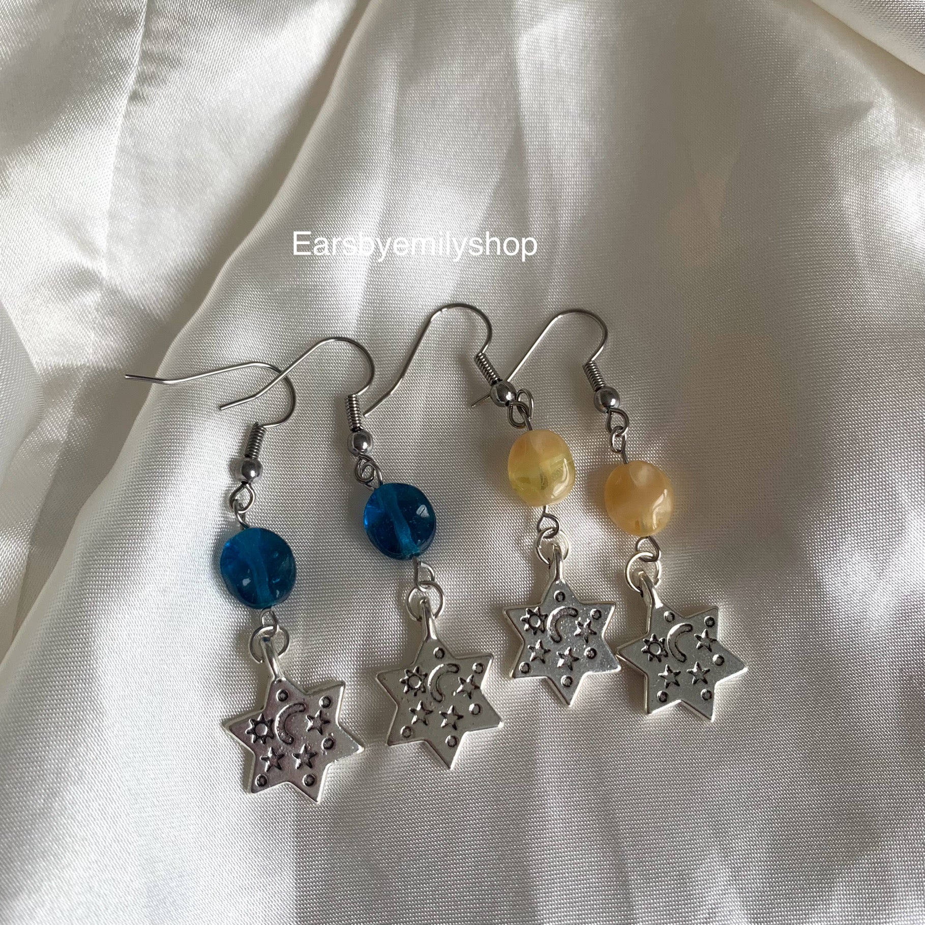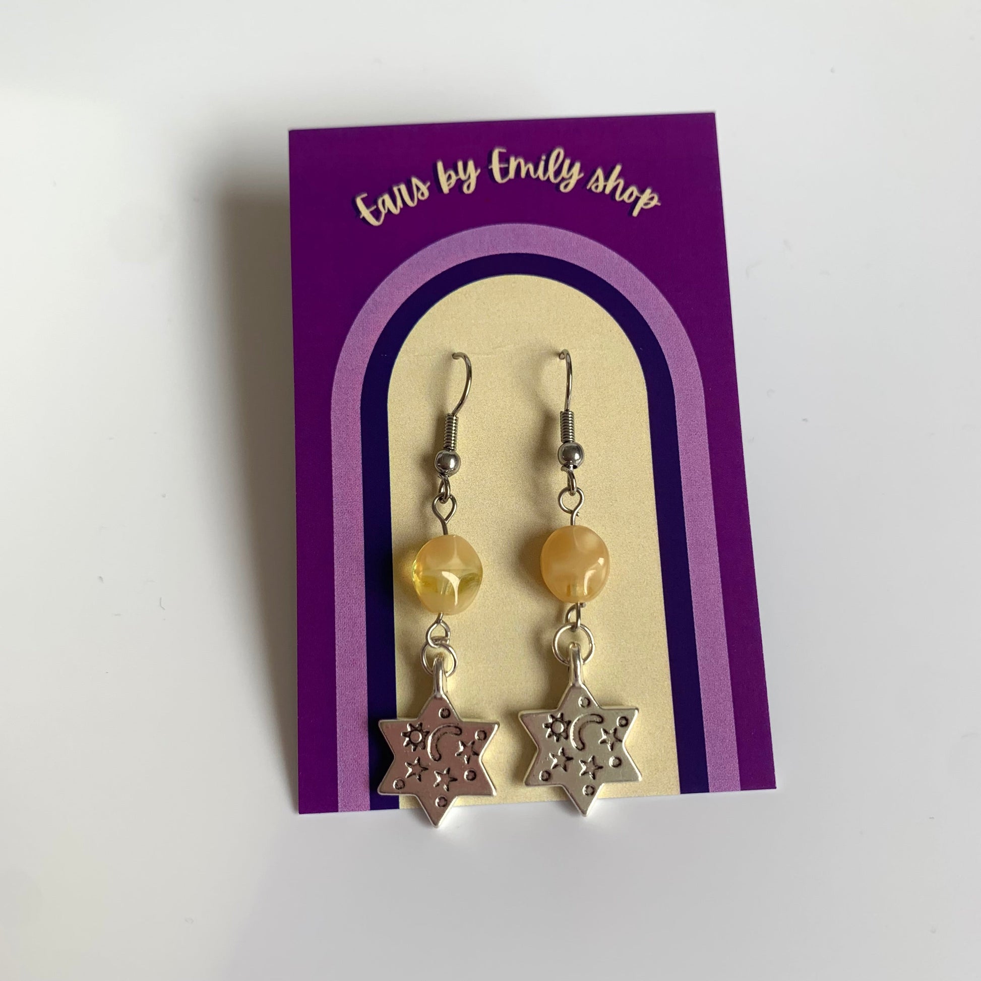 A cool pair of handmade silver star with yellow or blue bead earrings on hypoallergenic surgical steel hooks.