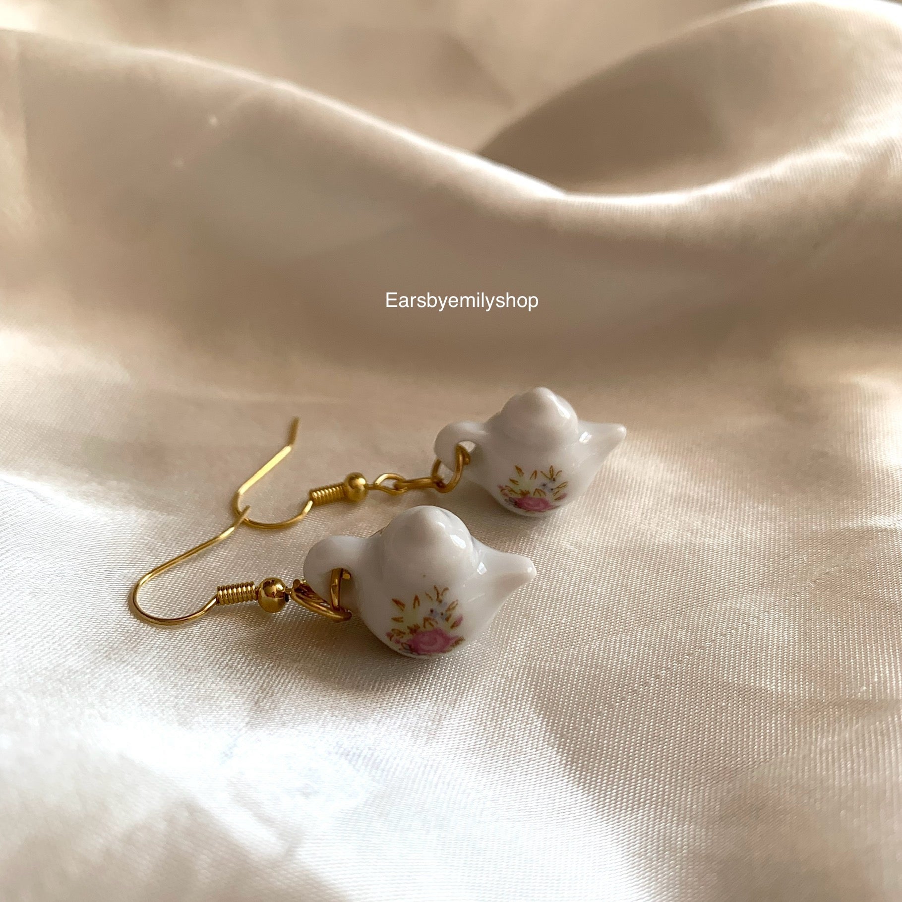 Cool white rose flower porcelain rustic tea pot gold or silver dangle earrings