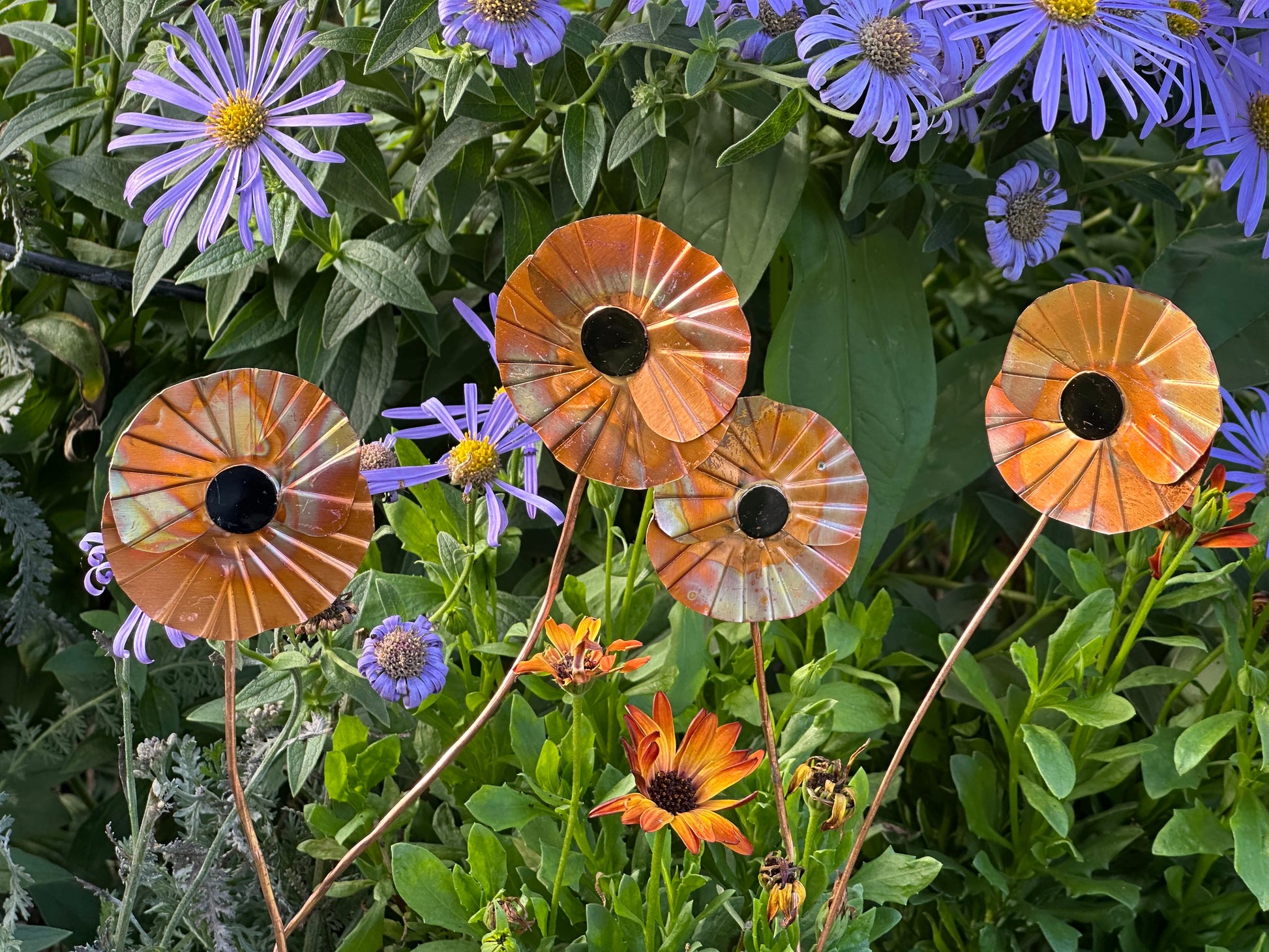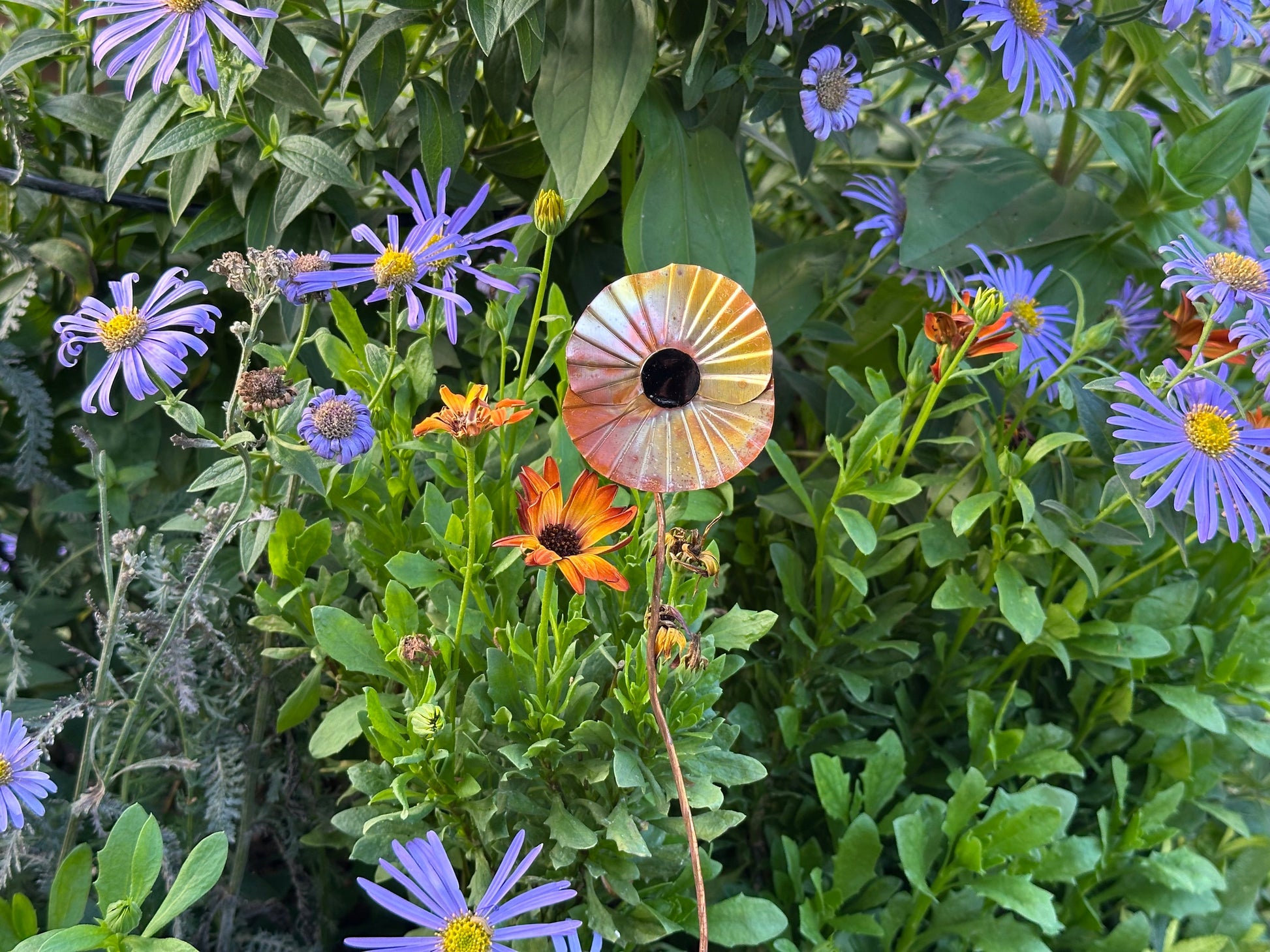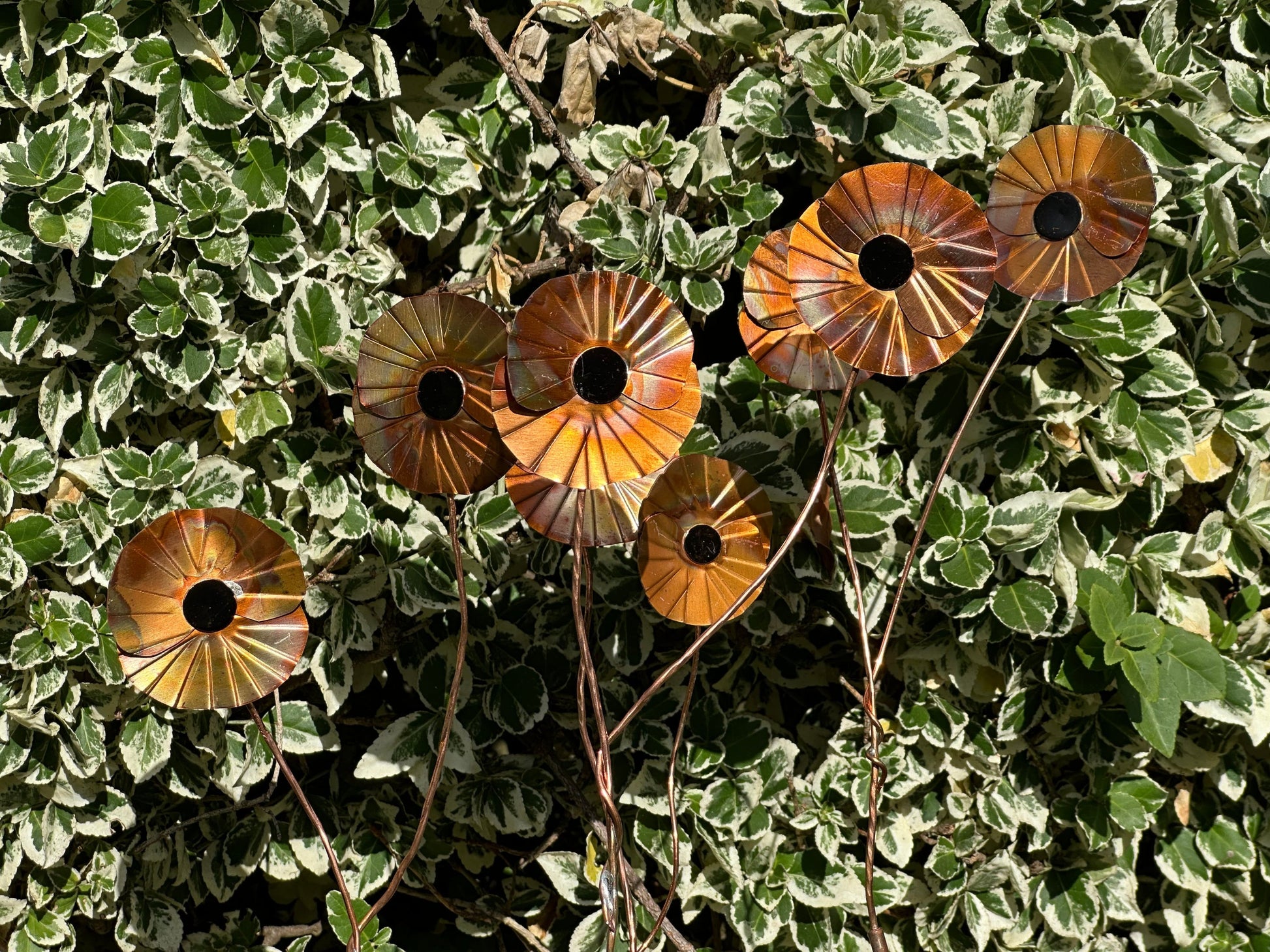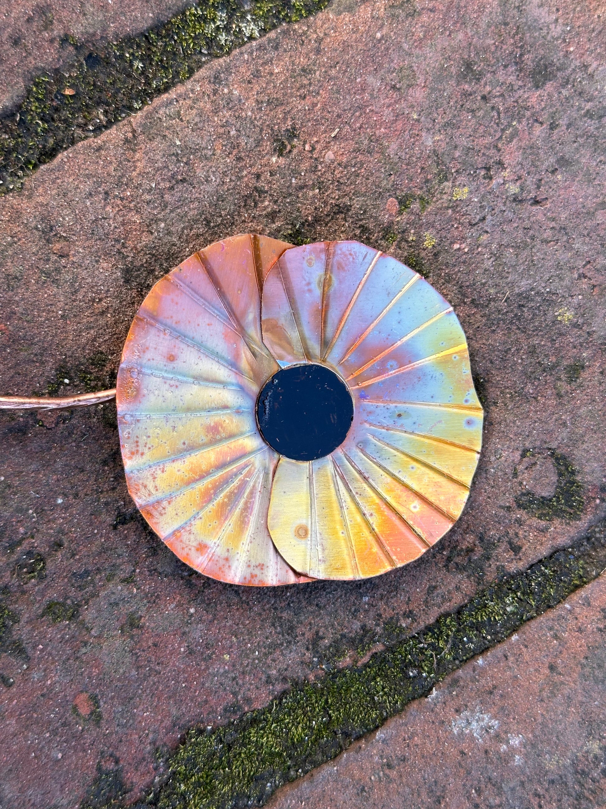 Hand made copper poppy. Keep indoors or out, the copper is lacquered to retain its colour.
