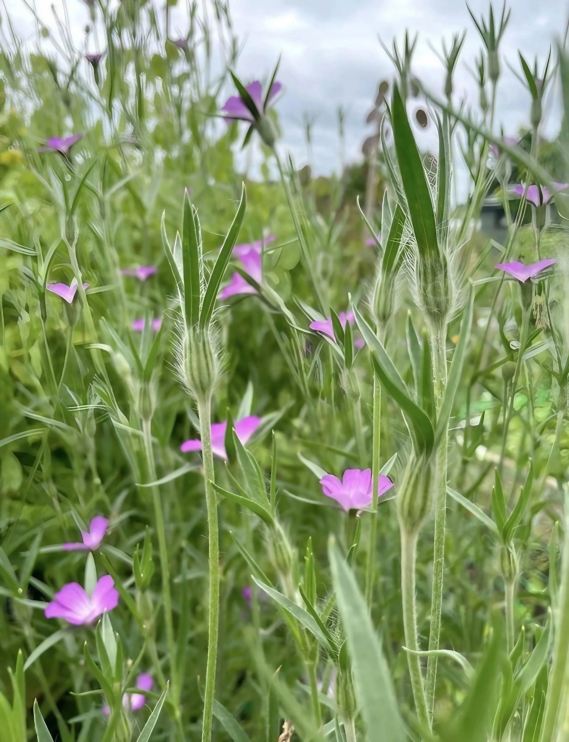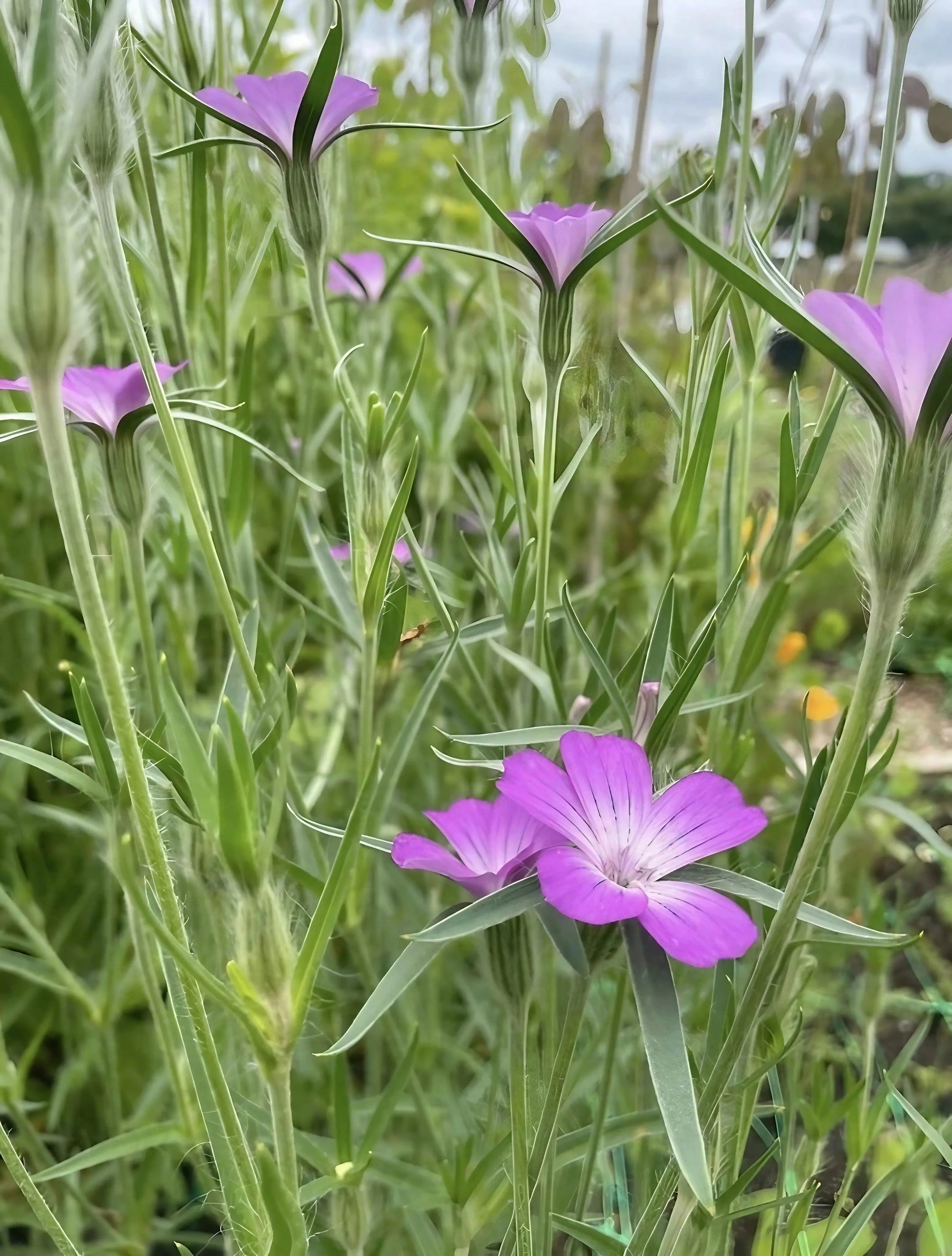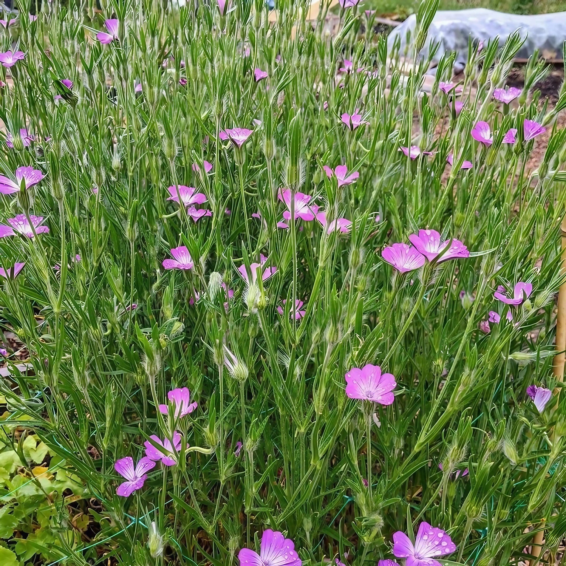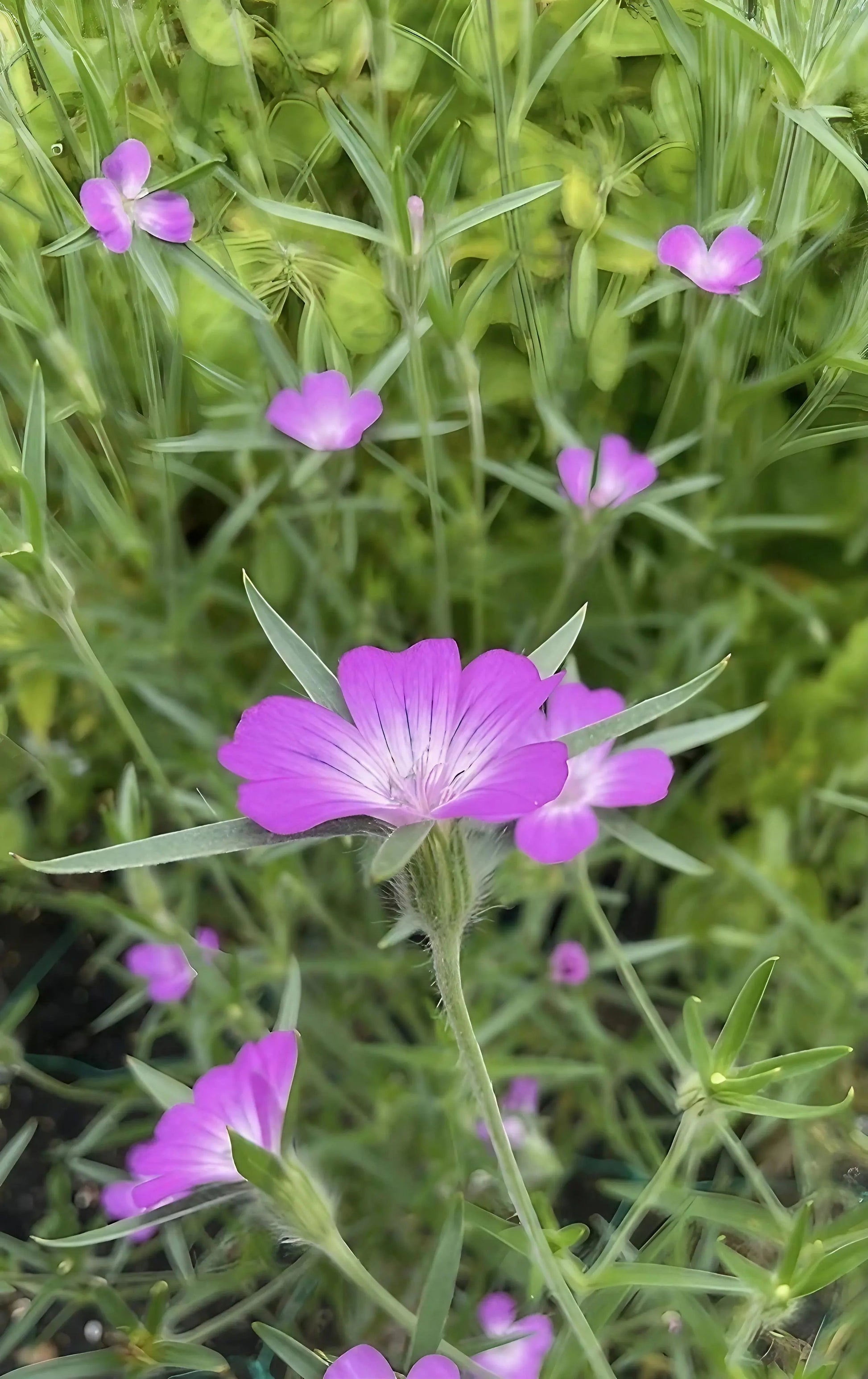 The "Weaving" Habit: Agrostemma has tall, thin, wiry stems (up to 90cm). It isn't designed to stand alone; in nature, it grows up through wheat and barley. In the garden, it looks best planted in groups or amongst grasses so the plants can support each other.