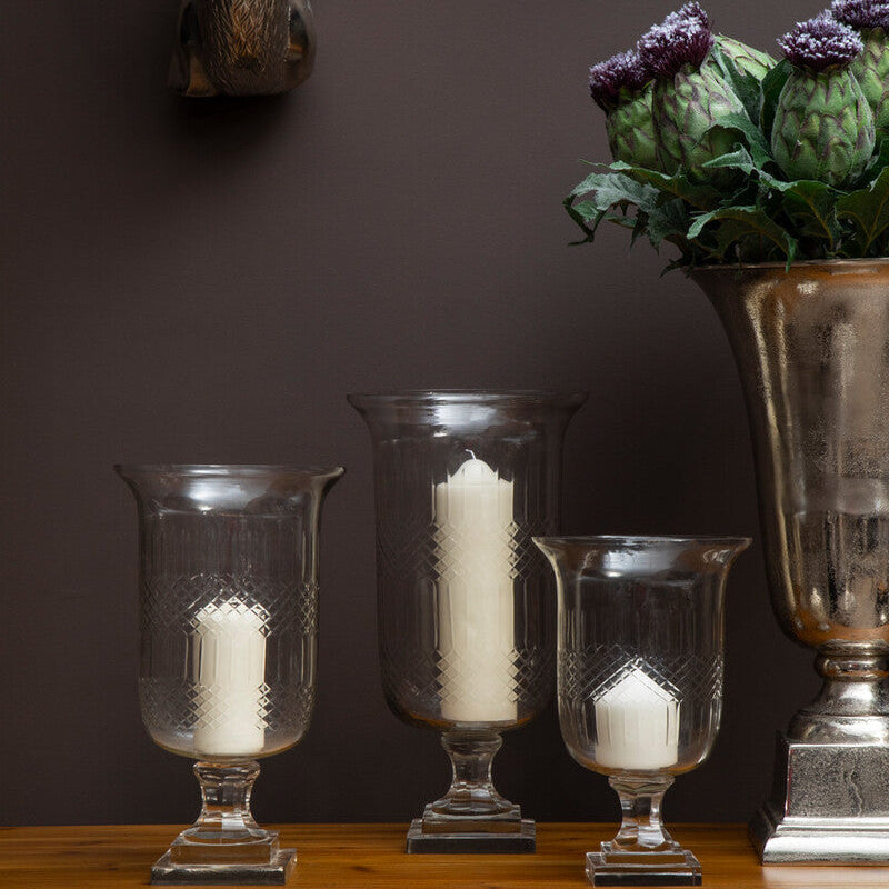 The Cortina Small Diamond Cut Candle Holder by Orsina offers the same clear glass elegance in a compact format.