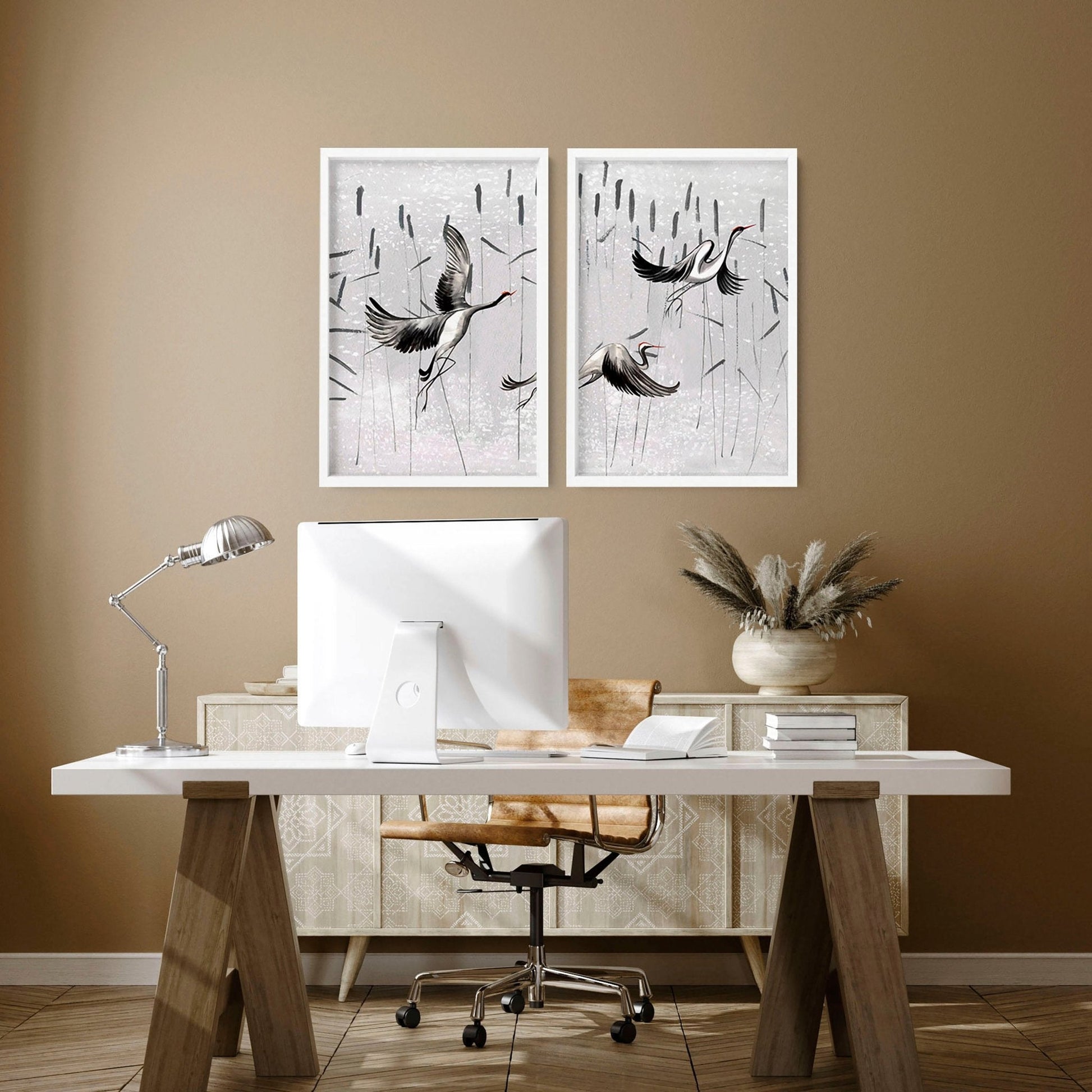 Immerse your home office in the tranquillity of Asian art with our set of Cranes in Japanese art wall art prints. Designed to inspire focus and serenity in your workspace. When hung side by side, this artwork features graceful crane motifs. Cranes symbolise longevity, peace, and harmony, creating an ambience of elegance and refinement.