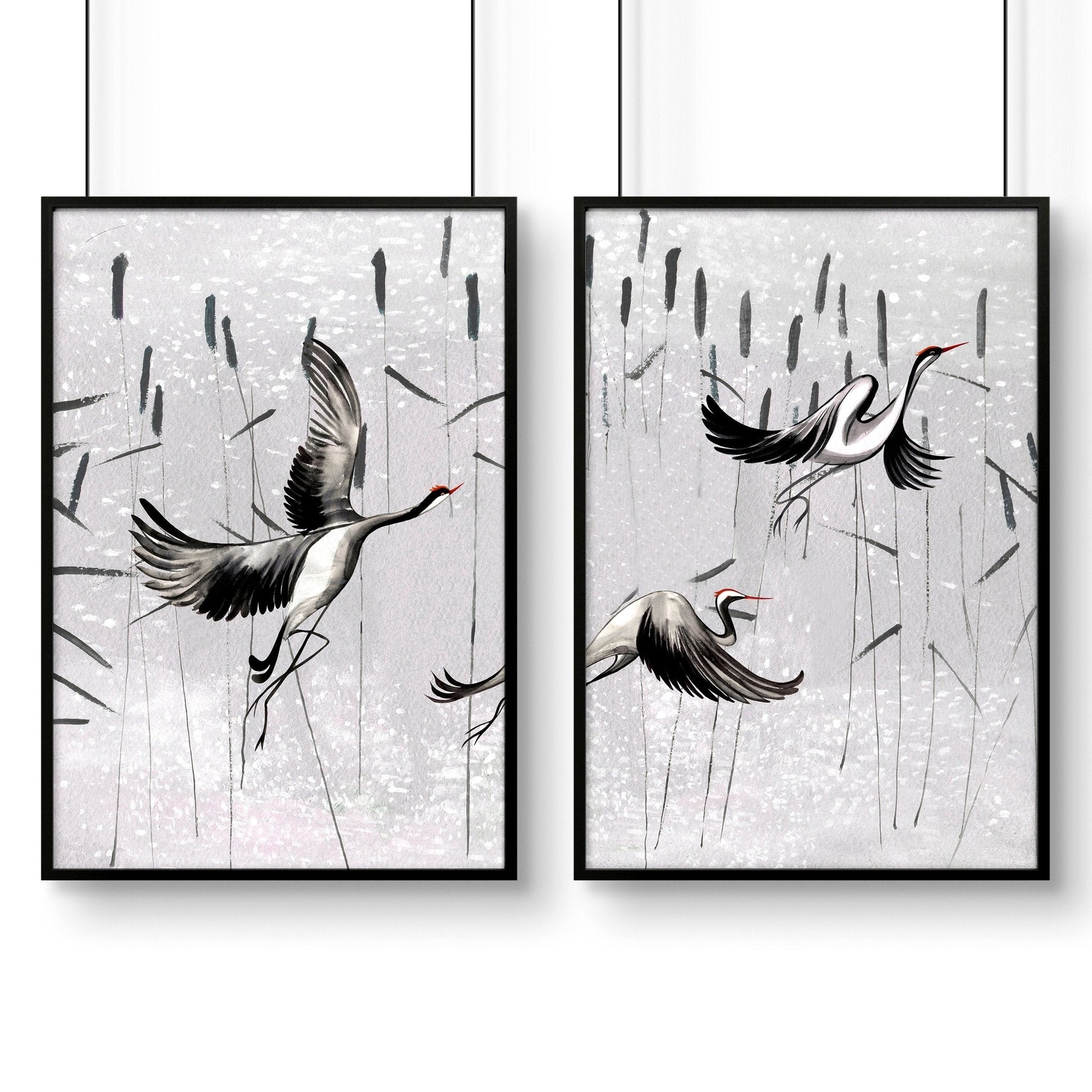 Cranes Japanese Art for home office | Set of 2 wall art prints