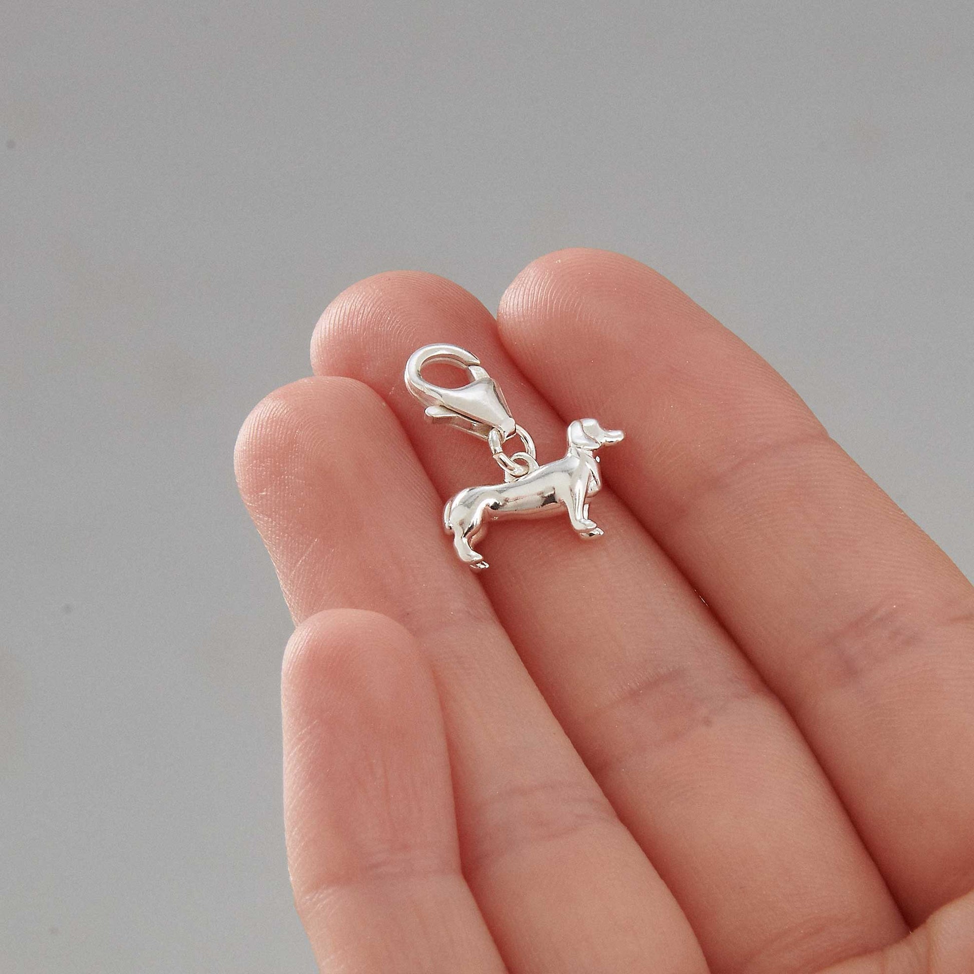 - An open jump ring allows your personalised sausage dog charm to be fixed easily to a traditional link chain charm bracelet.