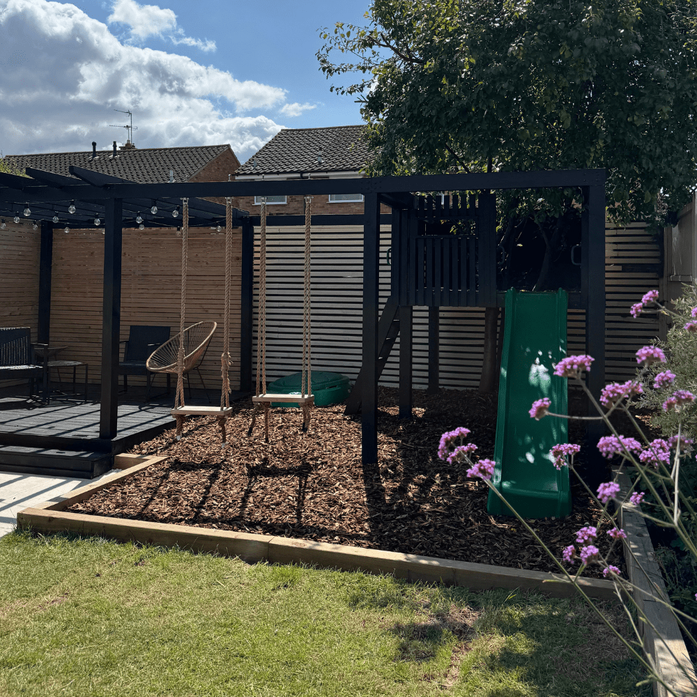 Dandy's PlaySafe Play Area Bark is a lovely natural product that is tested for impact so approved for use on playgrounds as a cushioning material - make sure you protect those little heads in case they come off the slide too fast or go right over the bar on the swings!