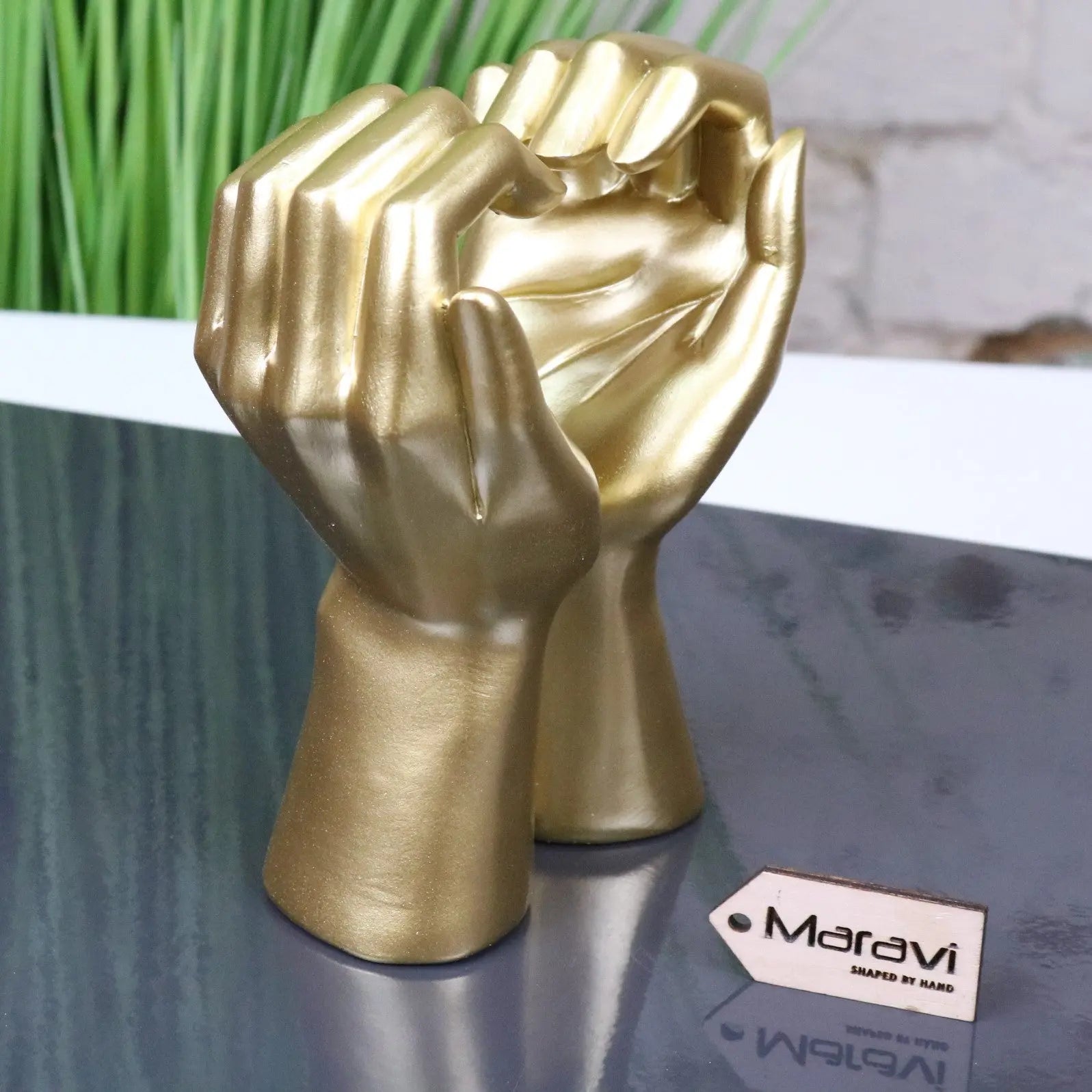 Celebrate connection and warmth with the Darela Love Heart Hands Ornament. Crafted from high-quality resin and finished in a radiant gold tone, this decorative piece depicts two hands gracefully forming a heart shape – a universal symbol of love and unity.