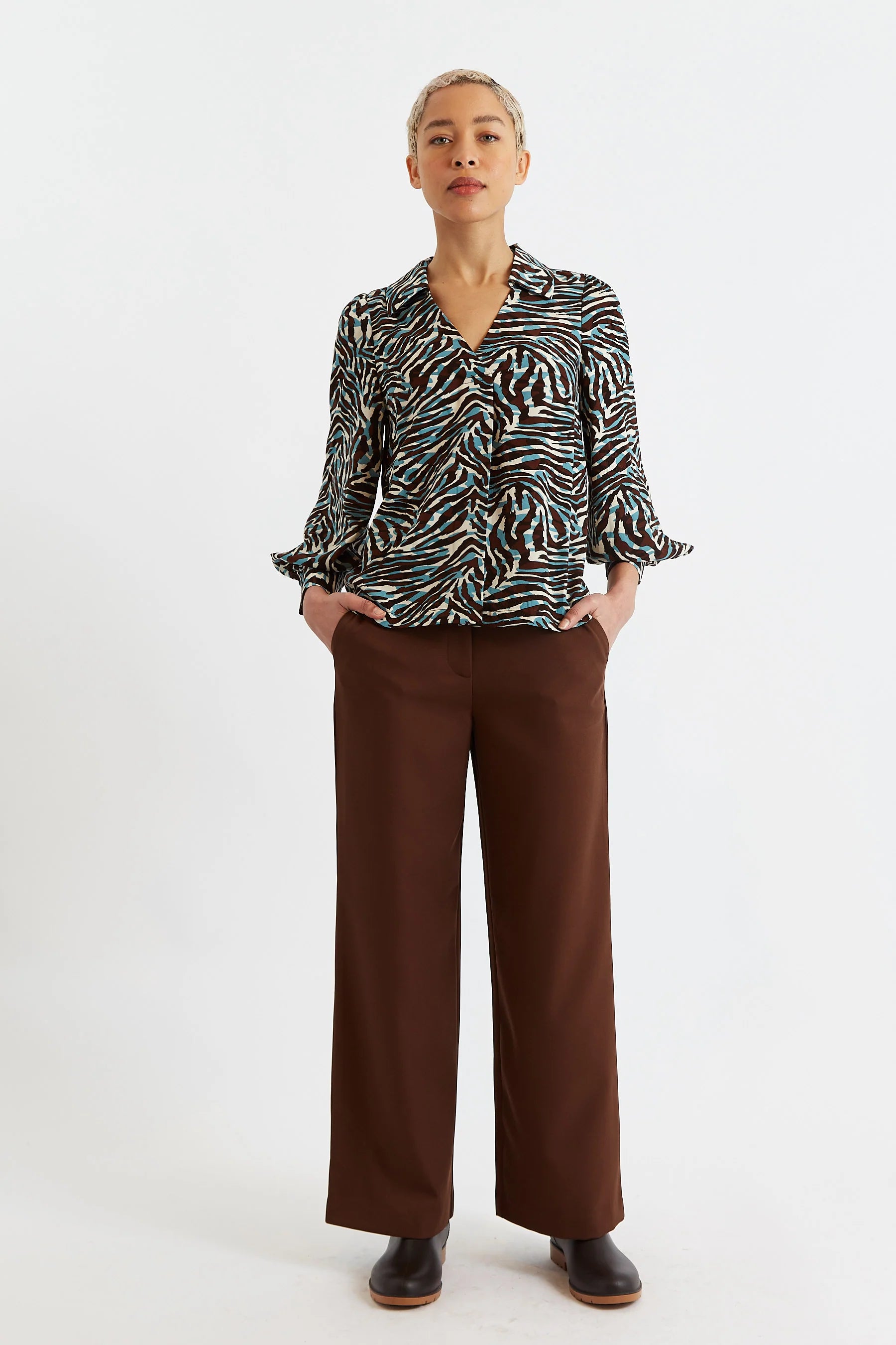 The Debbi Roar Print pop on shirt offers an effortless, relaxed fit and unique animal print pattern. With its signature chocolate, off-white, and teal colour combination, this shirt is perfect for creating a statement look.