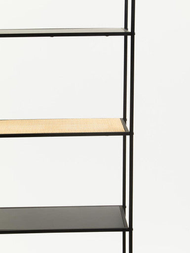 This black metal shelf unit has five levels of shelving, made of a combination of metal and natural rattan. The five tiers of shelves offer ample storage space for books, and magazines, while the open design makes it easy to access and display the items.